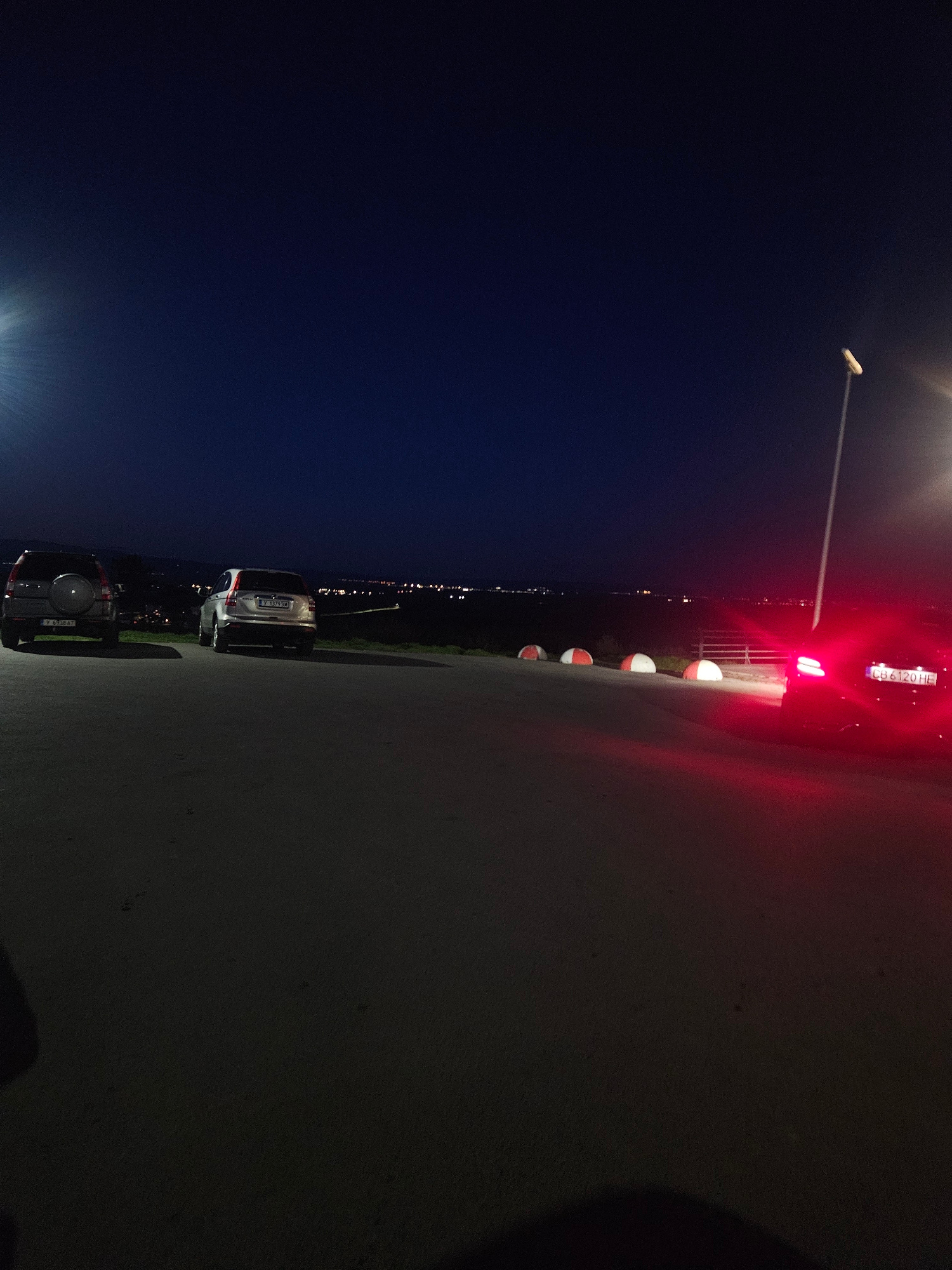 The image depicts a nighttime scene on the road in Yambol, Bulgaria. The sky is dark blue. A red light is prominently visible, possibly from a traffic signal or a warning beacon. A row of white and re…read more