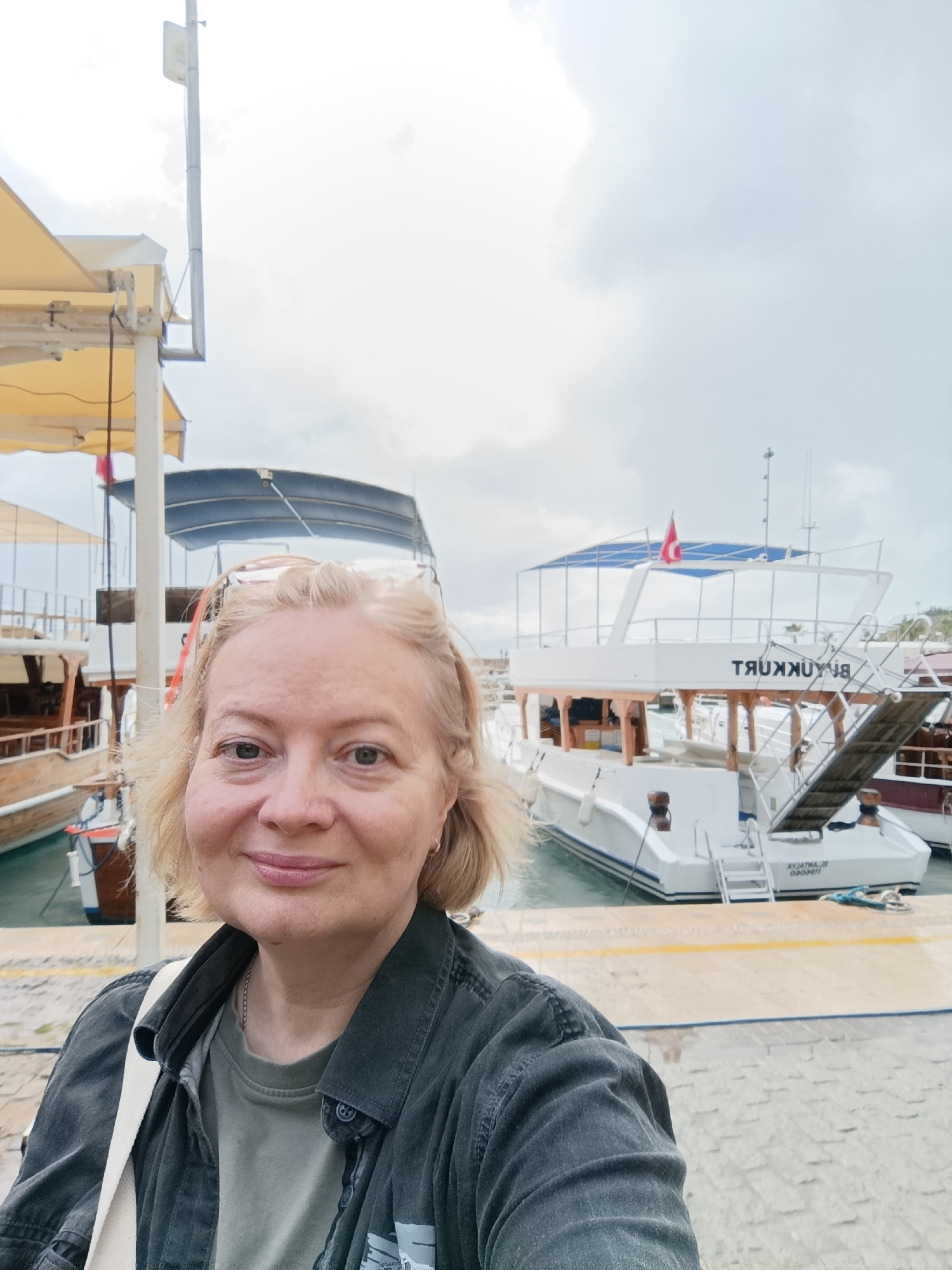 A medium shot captures a fair-skinned woman with short, blond hair, wearing a dark denim jacket and a light green t-shirt, standing on a dock. Behind her, docked boats fill the scene, with the largest…read more