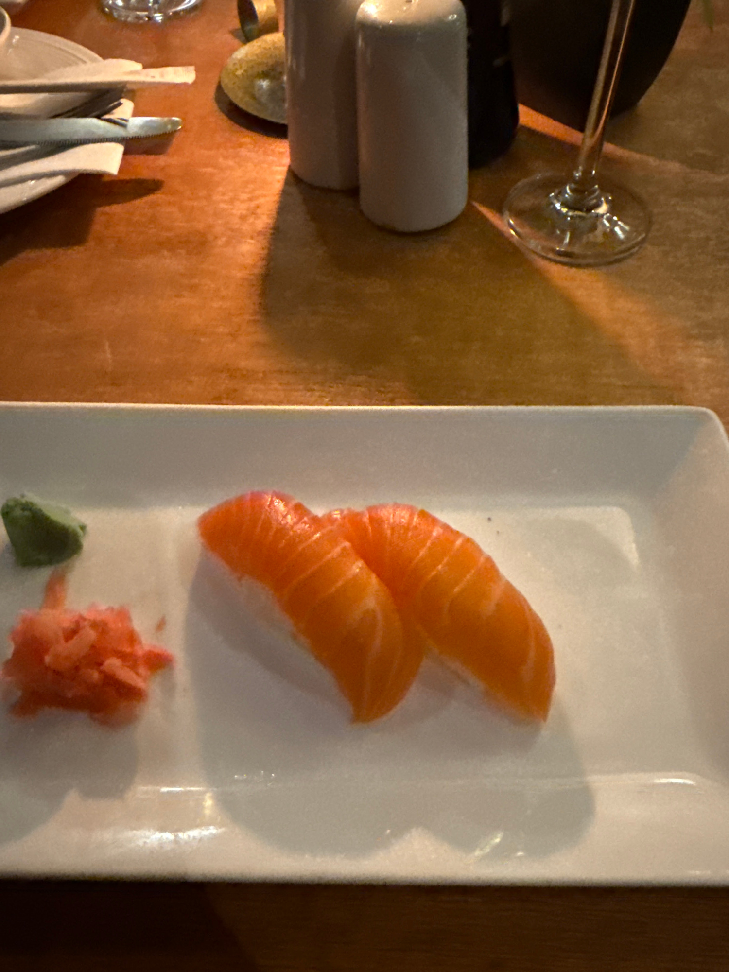 Here is a detailed description of the image: **Scene Overview:** The image shows a meal presentation on what appears to be a wooden table, likely inside a restaurant. There is a rectangular white pl…read more