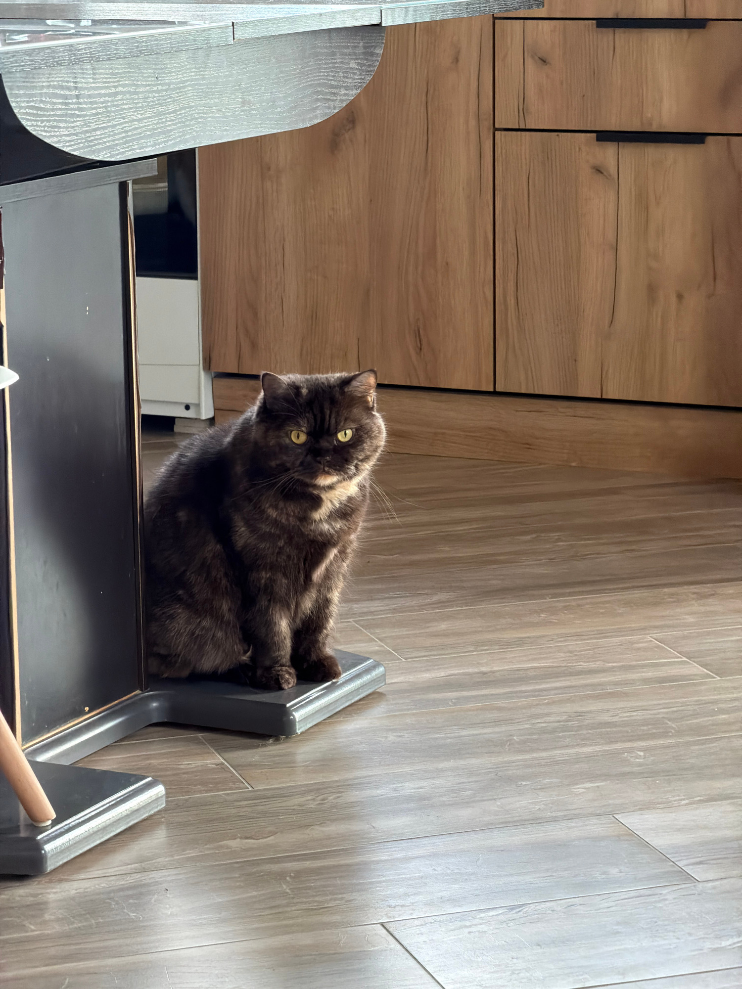 A dark-colored tortoiseshell cat with yellow eyes is sitting on a gray structure inside a building. The structure appears to be a piece of furniture, possibly a desk or a stand with ledges. The backgr…read more