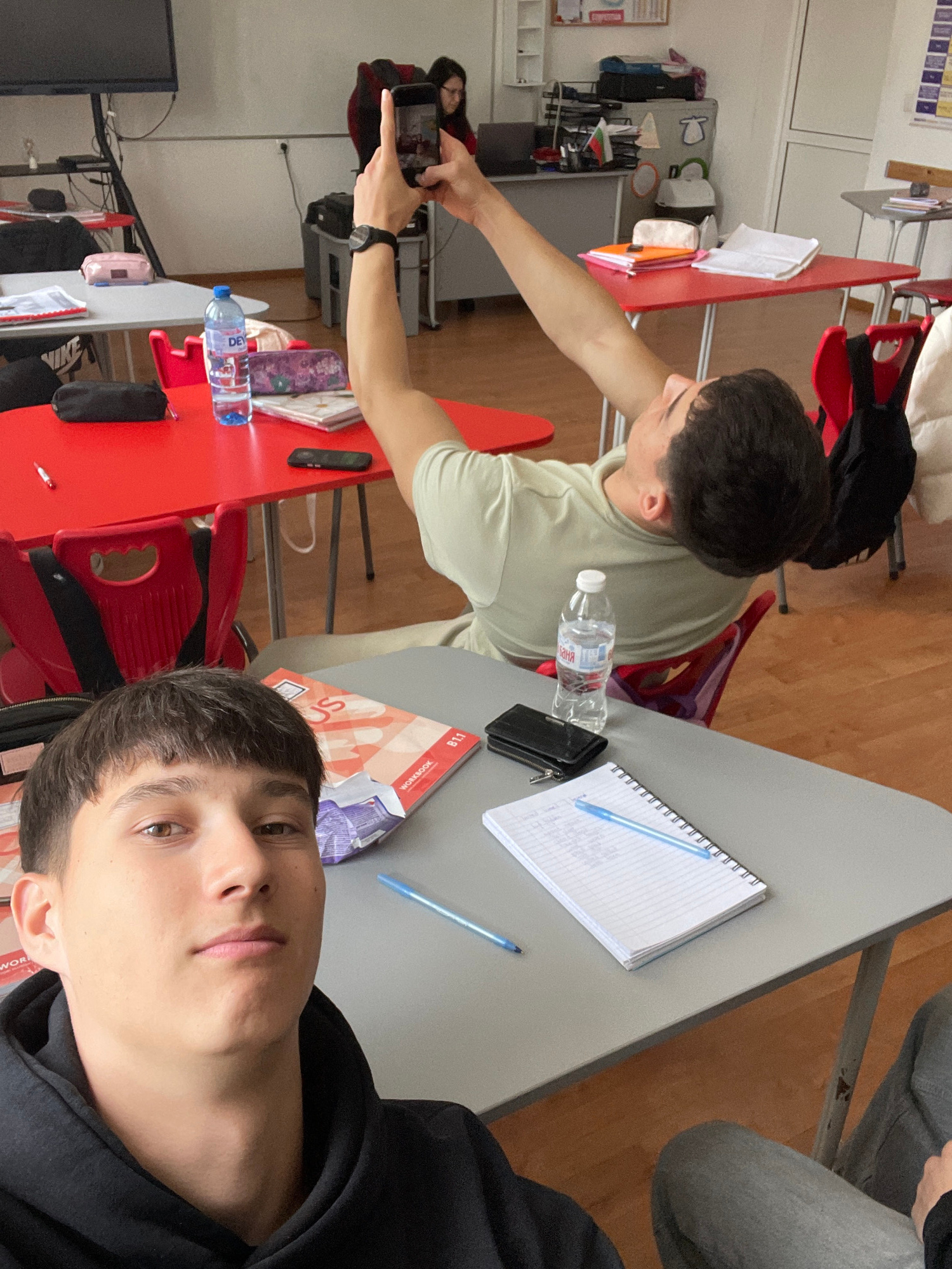 The image, rotated 90 degrees clockwise, captures an indoor scene, likely a classroom or study area in Zlatograd, Bulgaria. In the foreground, a young man with short dark hair, wearing a black hoodie,…read more