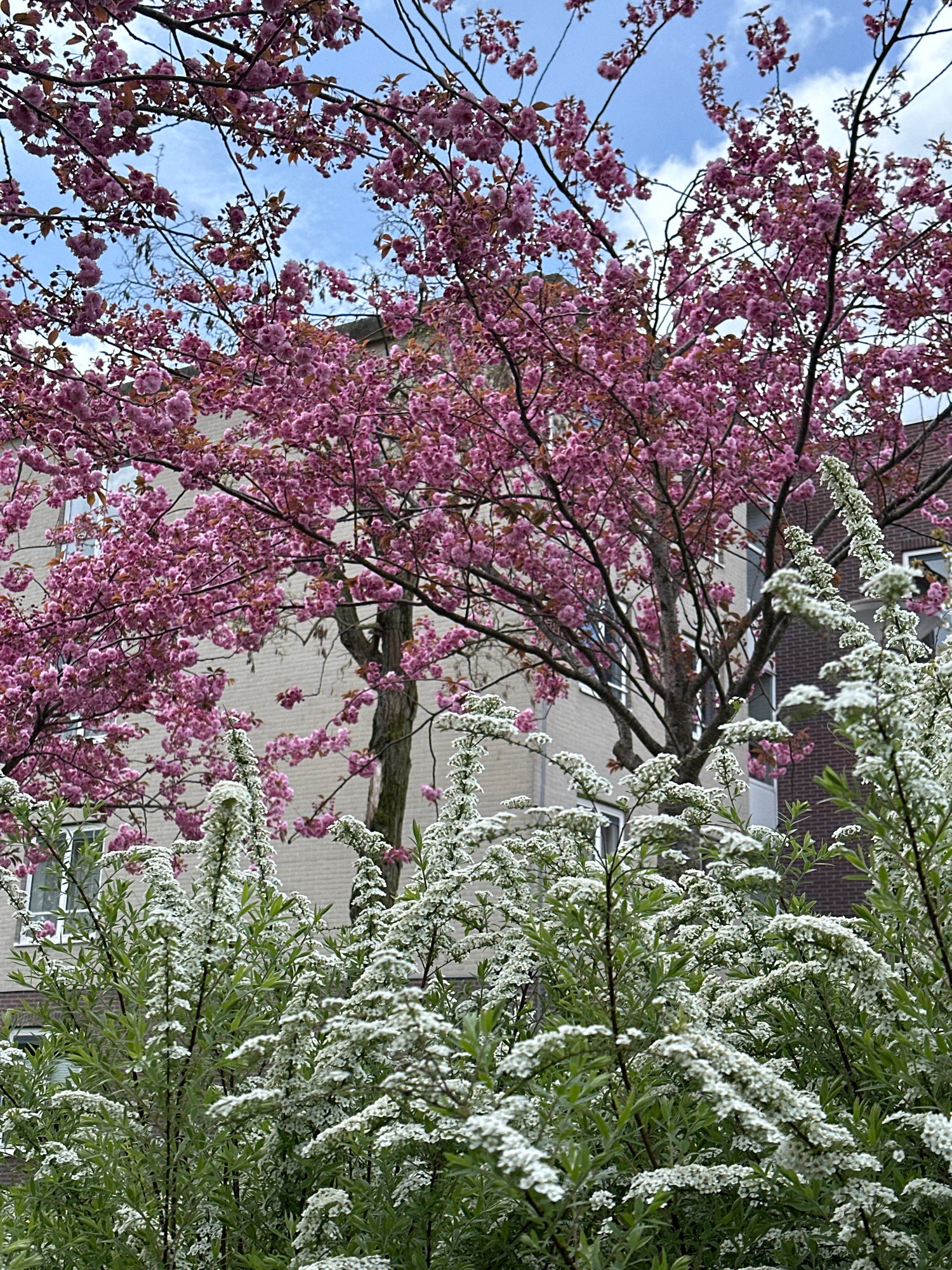 The image captures a scene in Amsterdam, Netherlands, showcasing trees in full bloom against the backdrop of residential buildings and a partly cloudy sky. On the left side of the frame, a tree with p…read more