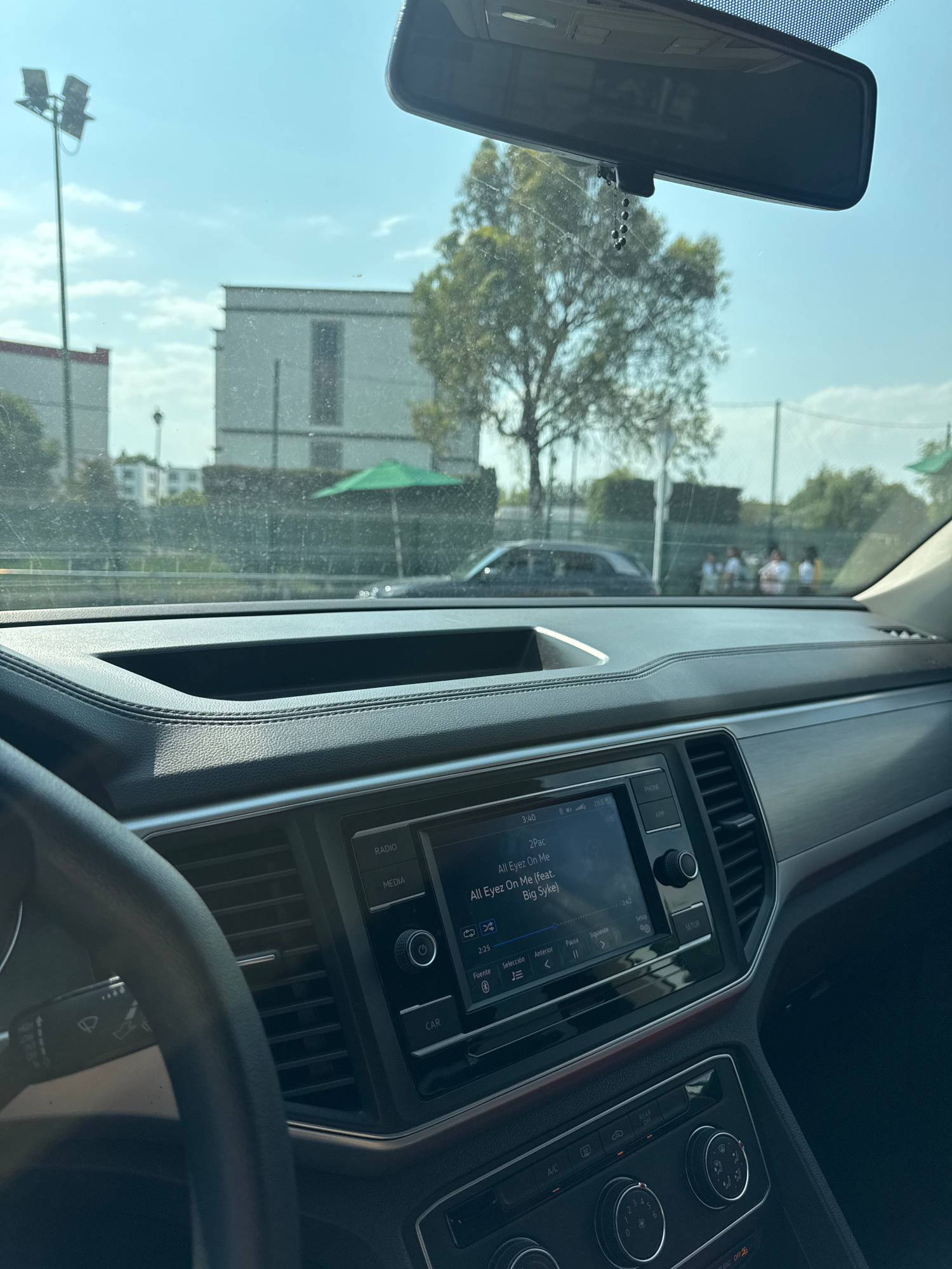 Here's a forensic description of the image: **Setting:** The image is taken from inside a car. The dashboard is visible, showing a media display with the song "All Eyez On Me" by 2Pac playing. There…read more