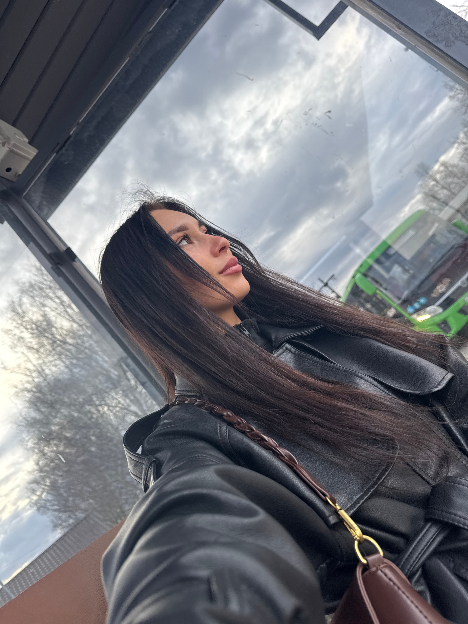 A selfie taken from within a bus shelter in Chaikovsky, Russia. A young woman with long, dark hair and light skin is the primary subject, partially obscuring the view. She wears a black leather jacket…read more
