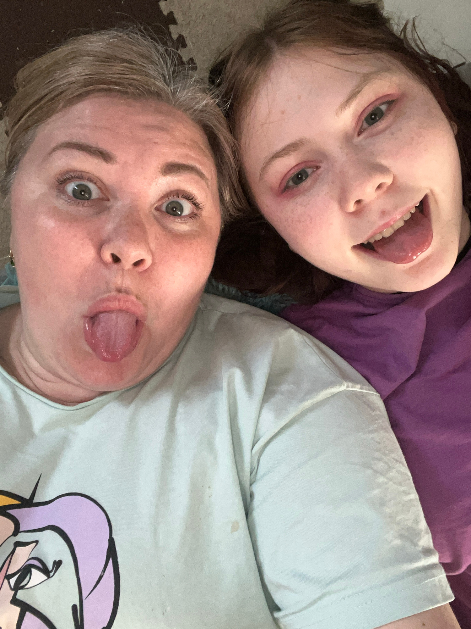 Two individuals, a child and an adult, are captured in a close-up selfie. Both individuals are lying down, facing the camera with their tongues extended. The child, located in the upper part of the fr…read more