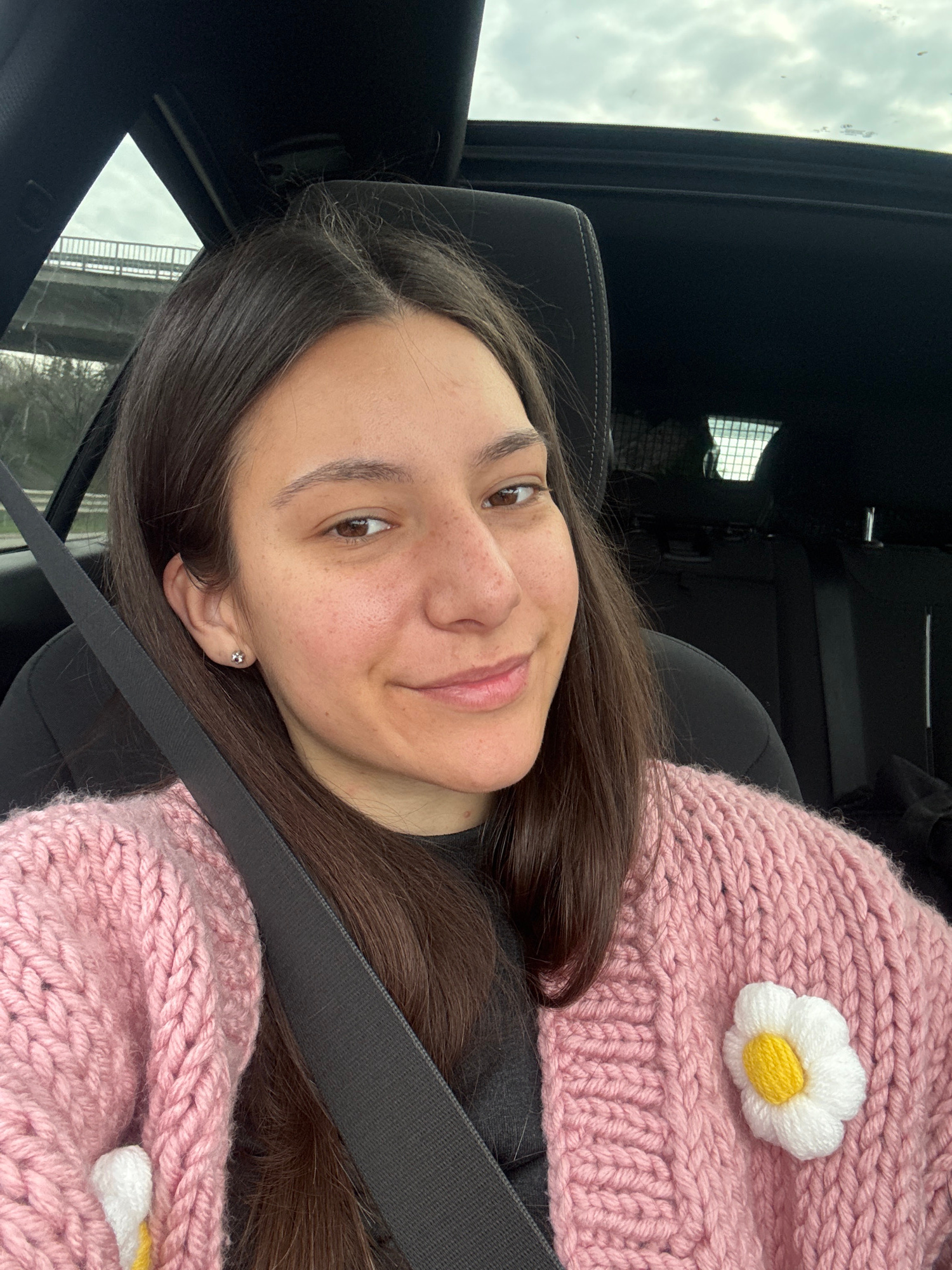 A young woman is seated inside a vehicle, likely a car, wearing a pink, chunky-knit scarf with a white and yellow flower embellishment. She has dark hair and is wearing a seatbelt. She is looking dire…read more