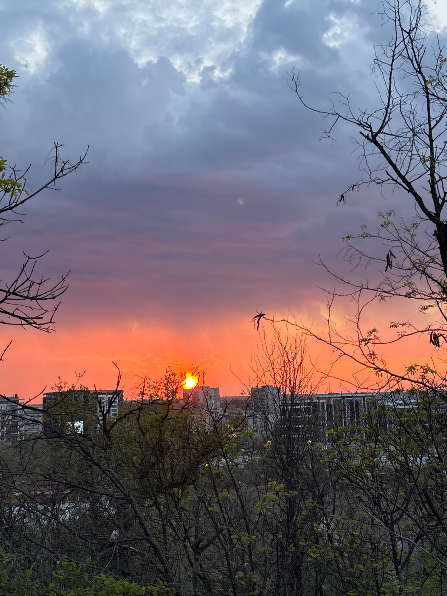 The image shows a sunset scene in an urban environment, likely Plovdiv, Bulgaria. The sun, a bright orange orb, is positioned low on the horizon. The sky transitions from a vibrant orange near the sun…read more
