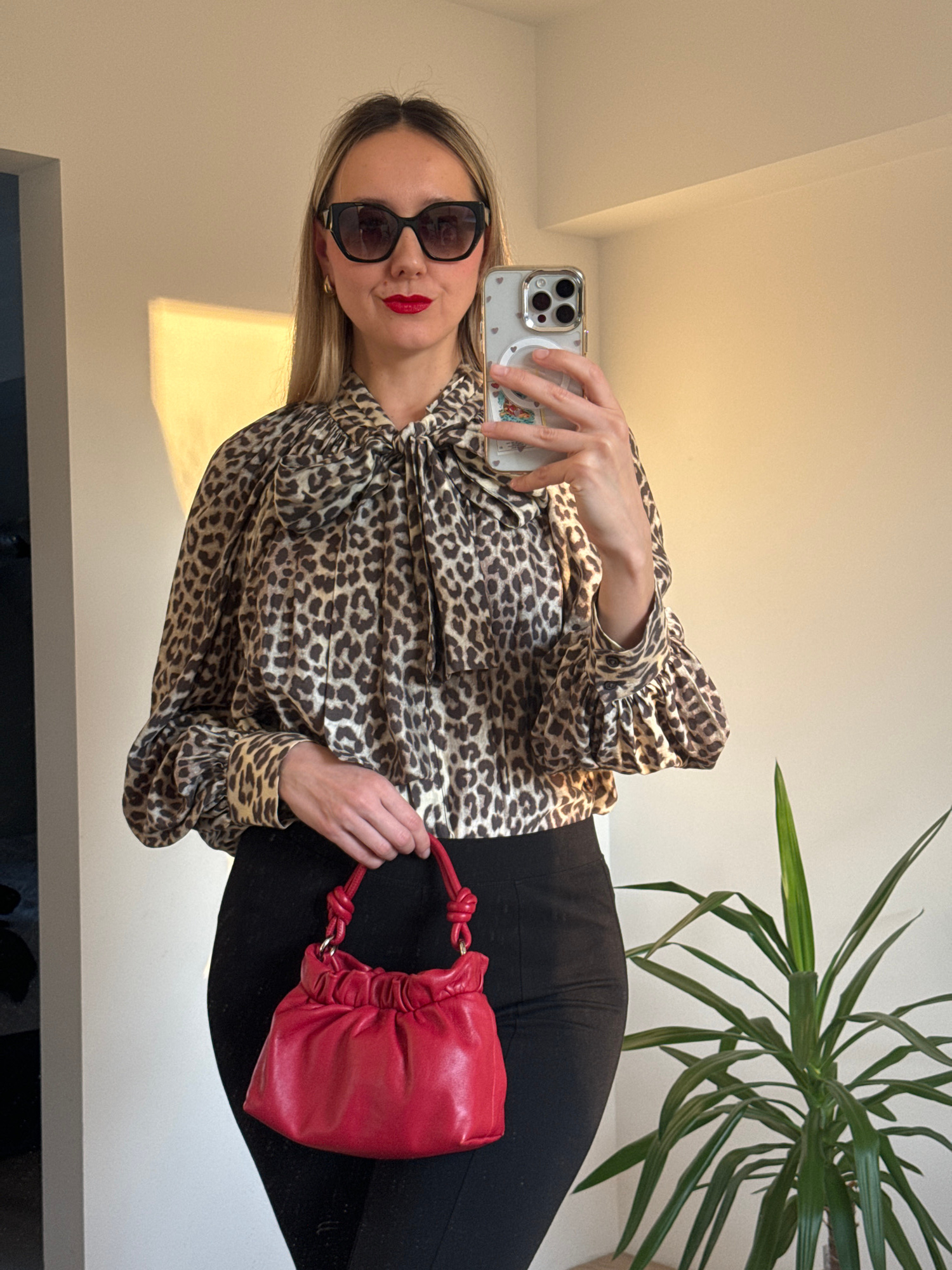A woman is taking a selfie in a room with a plant. She is wearing sunglasses, a leopard-print blouse, and black pants. She is holding a red purse. The location is unclear, so the city cannot be determ…read more