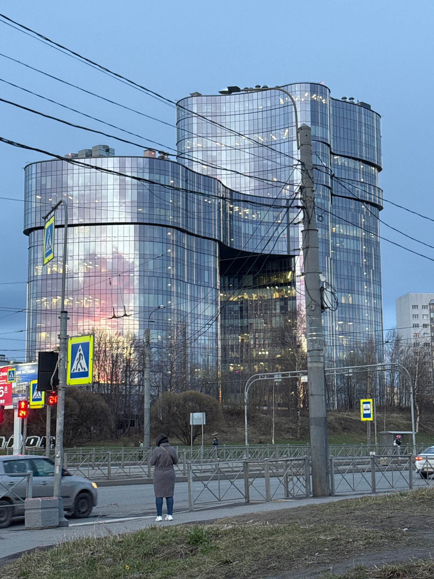 The image captures a street scene in Saint Petersburg, Russia, with a modern, curved glass office building as the primary backdrop. The building's façade reflects the setting sun, creating a warm glow…read more