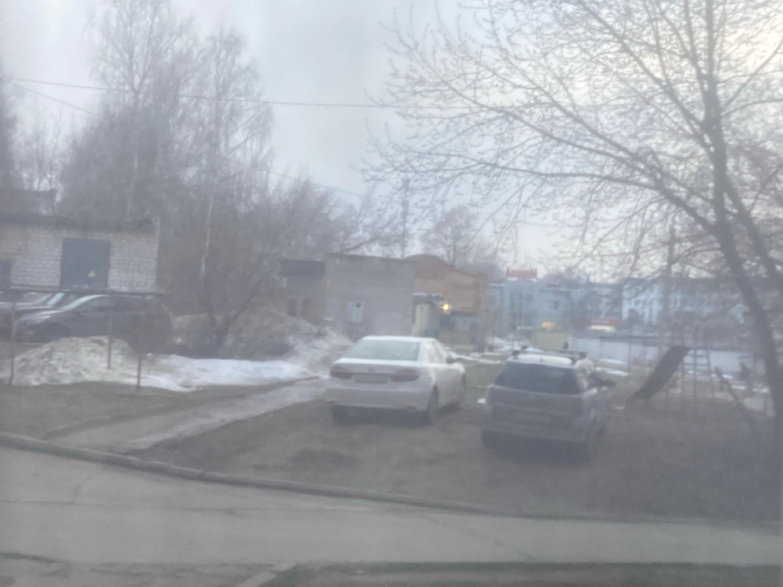 The image depicts a cloudy day in what appears to be a residential area in Chaikovsky, Russia. In the foreground, the lower portion of a window frame is visible, suggesting the photo was taken from in…read more