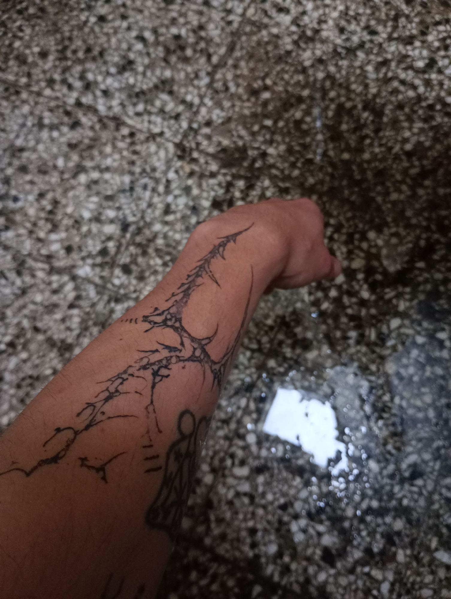 An adult human forearm is presented in a scene with a light, terrazzo-style floor covered partially in water. The forearm features a black ink tattoo design, which appears to be a combination of abstr…read more
