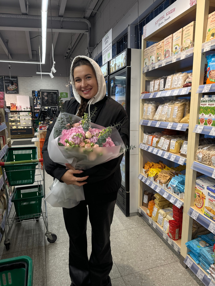 The image depicts a female individual standing in an aisle of a grocery store in Odintsovo, Russia. She is smiling, looking directly forward, and wears a black jacket over a white hooded sweatshirt wi…read more