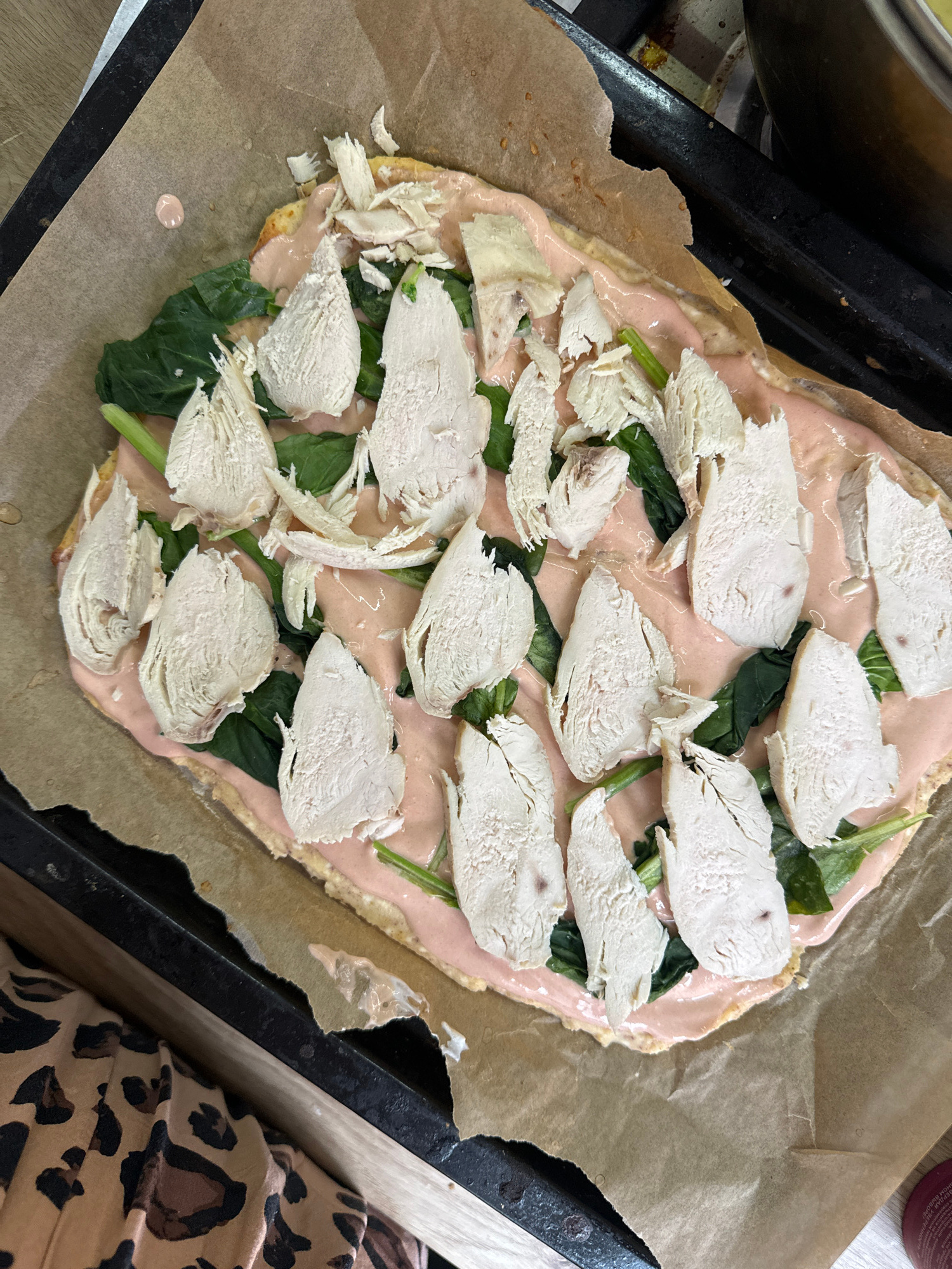 The image shows an uncooked pizza on a baking sheet lined with parchment paper. The pizza appears to have a pink sauce base, topped with spinach and sliced, cooked chicken. The image includes a glimps…read more