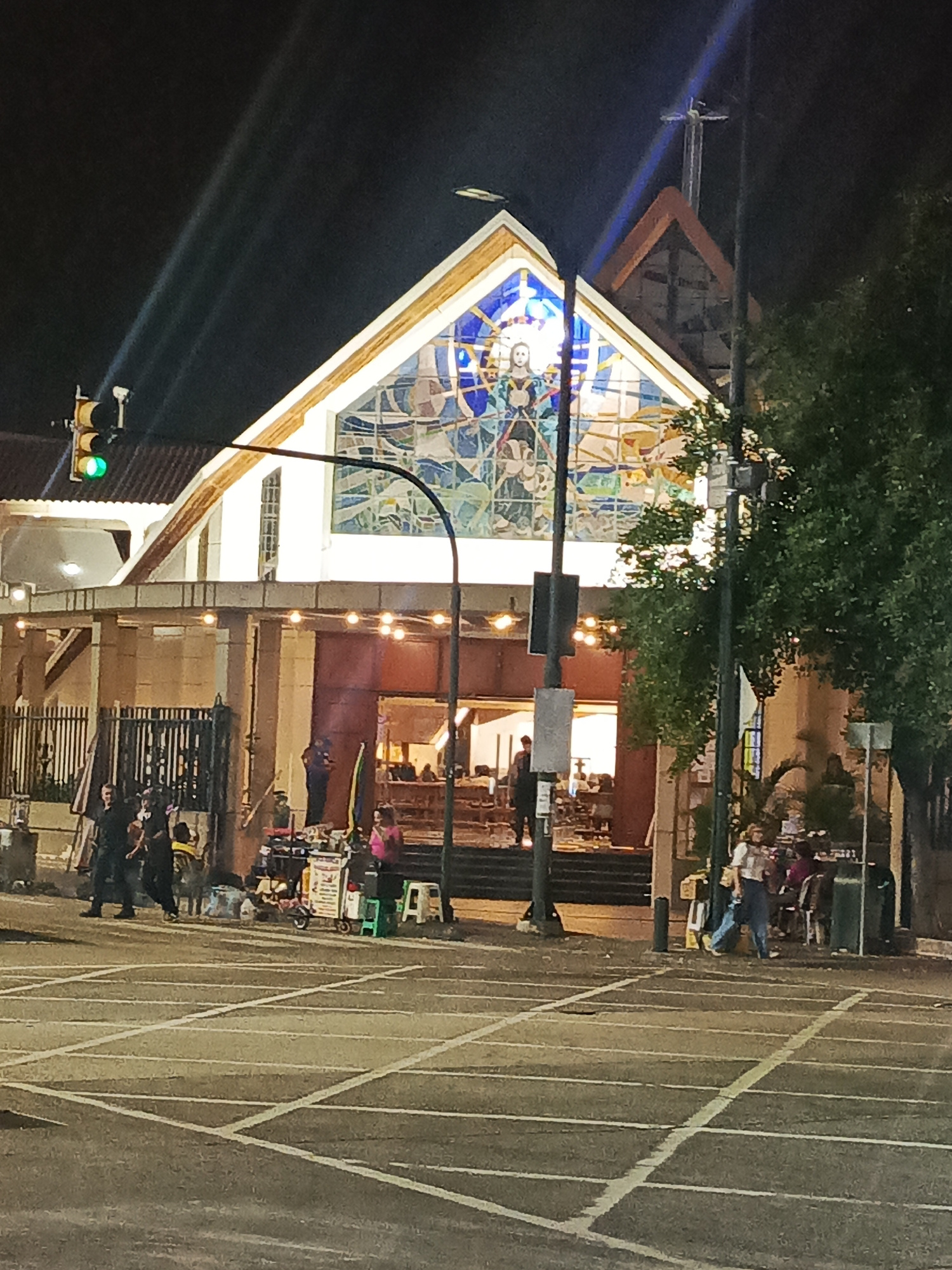 The image shows the Iglesia San Gabriel Arcángel church in Guayaquil, Ecuador, at night. The church has a distinctive triangular stained-glass window above the entrance and a cross on top of a seconda…read more