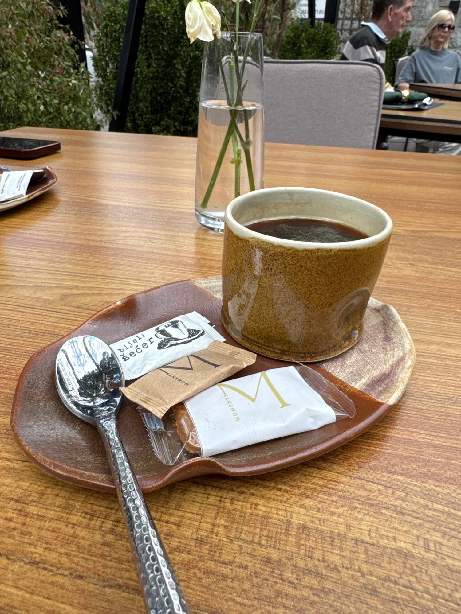 The image shows a table setting in an outdoor cafe in Dobrota, Montenegro. The table is wooden and holds a ceramic mug filled with coffee, placed on a decorative saucer. Next to the mug are packets ofโฆread more