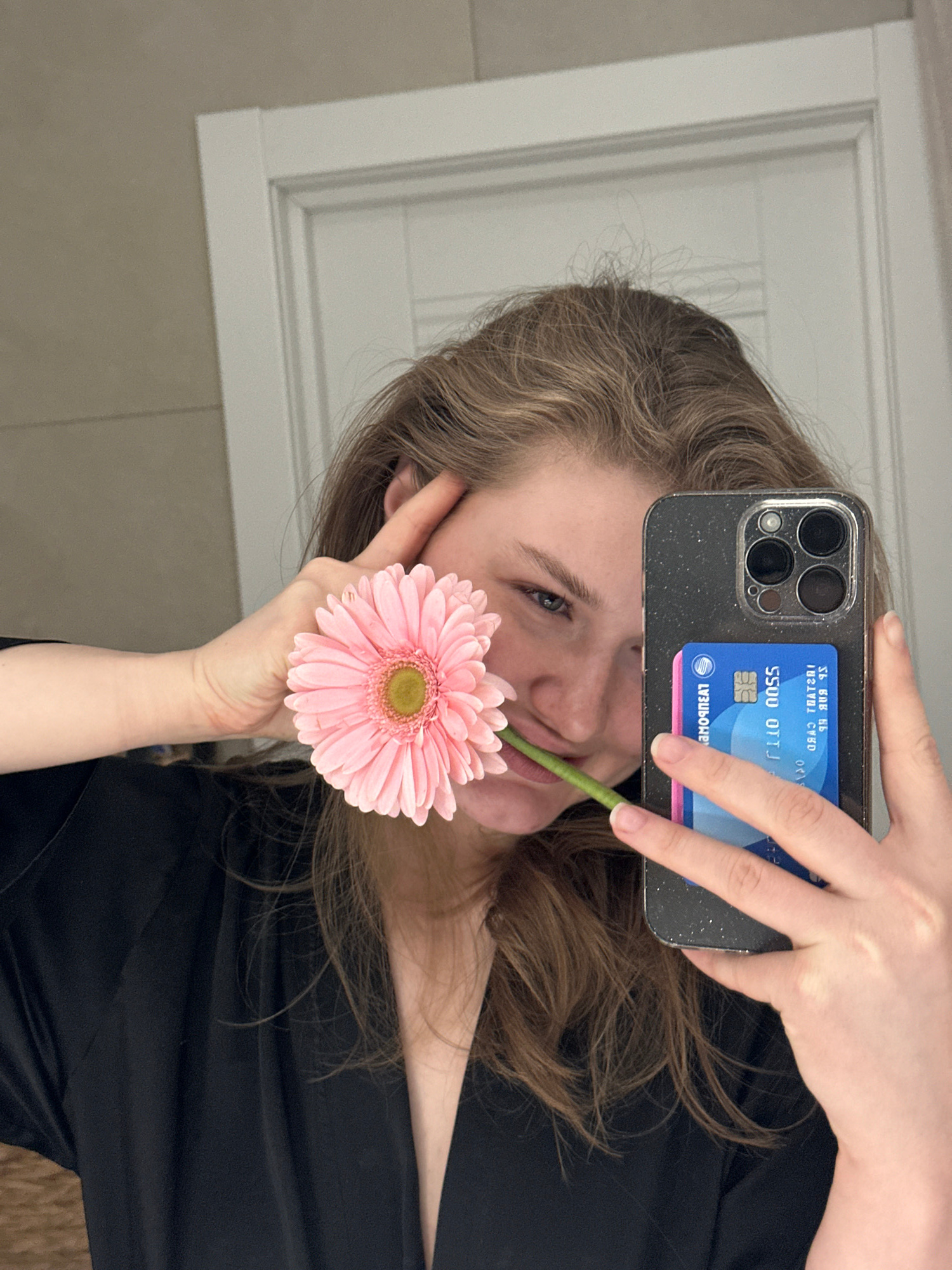 The image is a mirror selfie depicting a young adult female indoors. She has light brown hair and is wearing a black garment. Her left hand holds a pink Gerbera daisy, with its stem positioned near he…read more