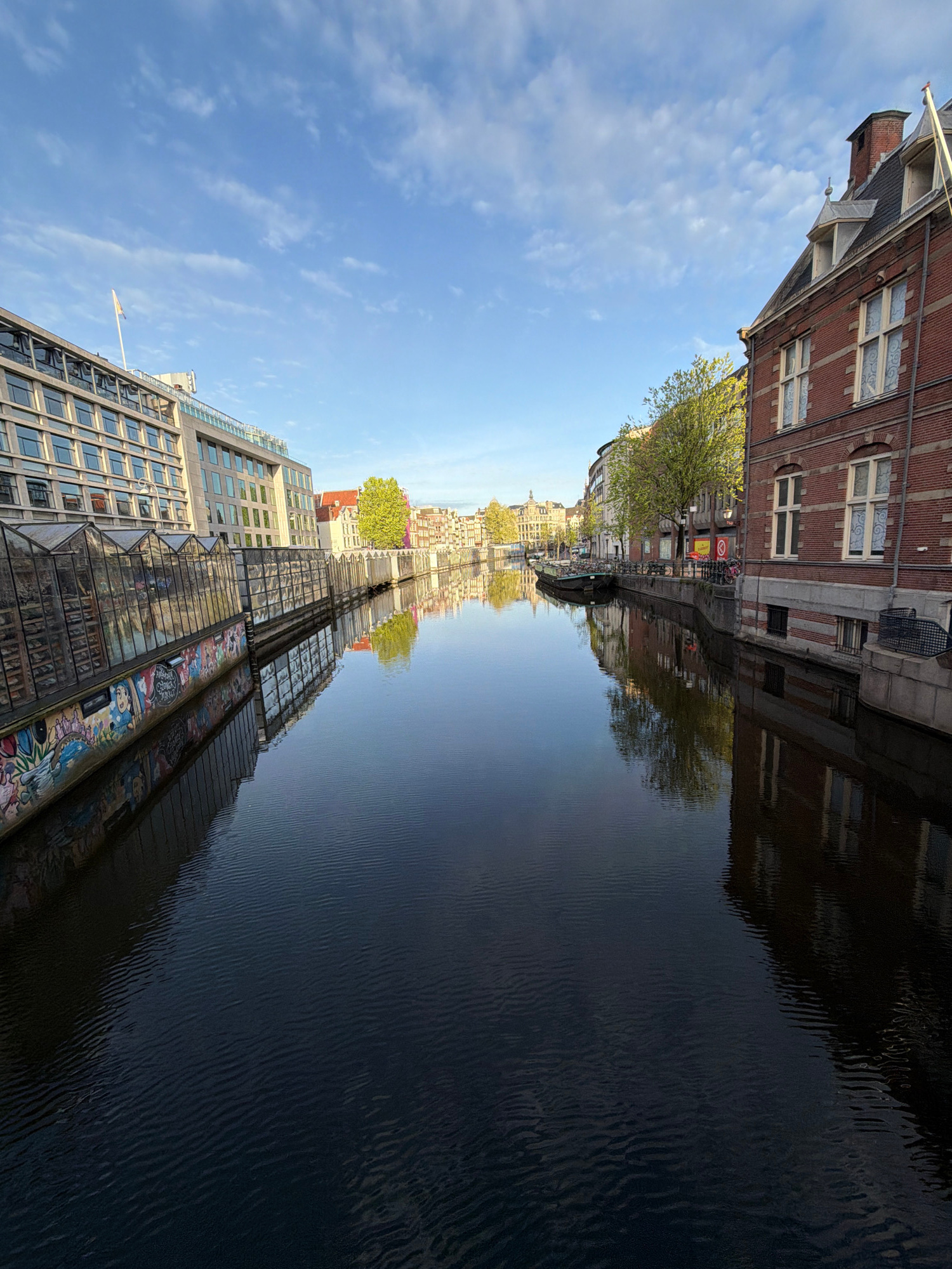 This image captures a vibrant canal scene in Amsterdam, Netherlands, showcasing a blend of traditional and modern architecture under a clear, bright blue sky dotted with scattered white clouds. The li…read more