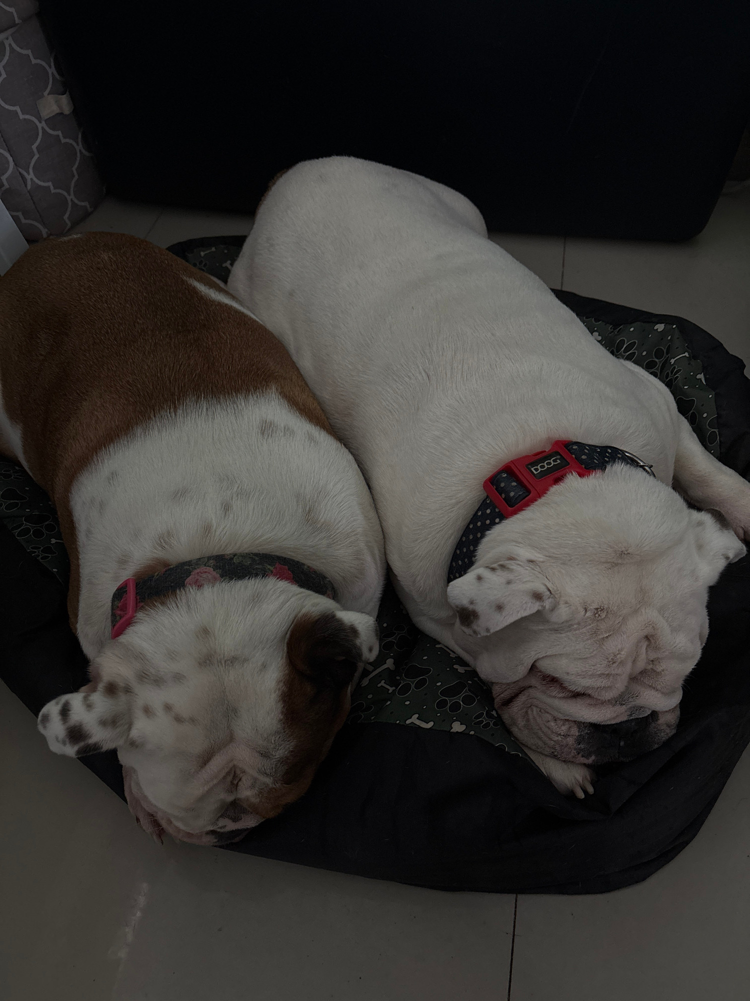 The image, captured from an overhead perspective, displays two Bulldogs sleeping peacefully side-by-side on dog beds indoors. The scene is characterized by dim lighting, suggesting an indoor setting w…read more