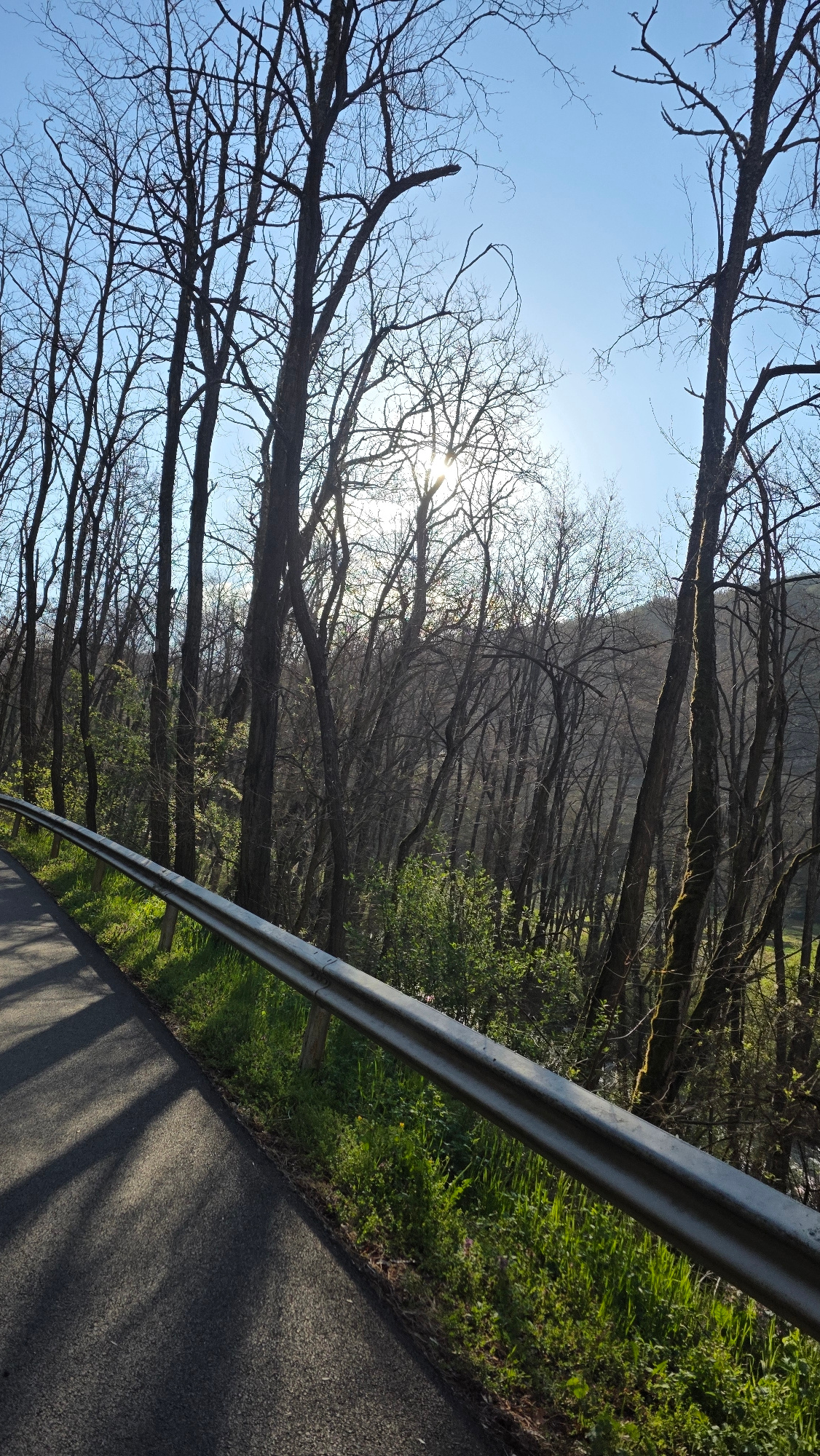 The image shows a road in a wooded area. The road runs diagonally from the lower right to the upper left of the frame. A metal guardrail runs along the right side of the road. To the left of the guardβ¦read more