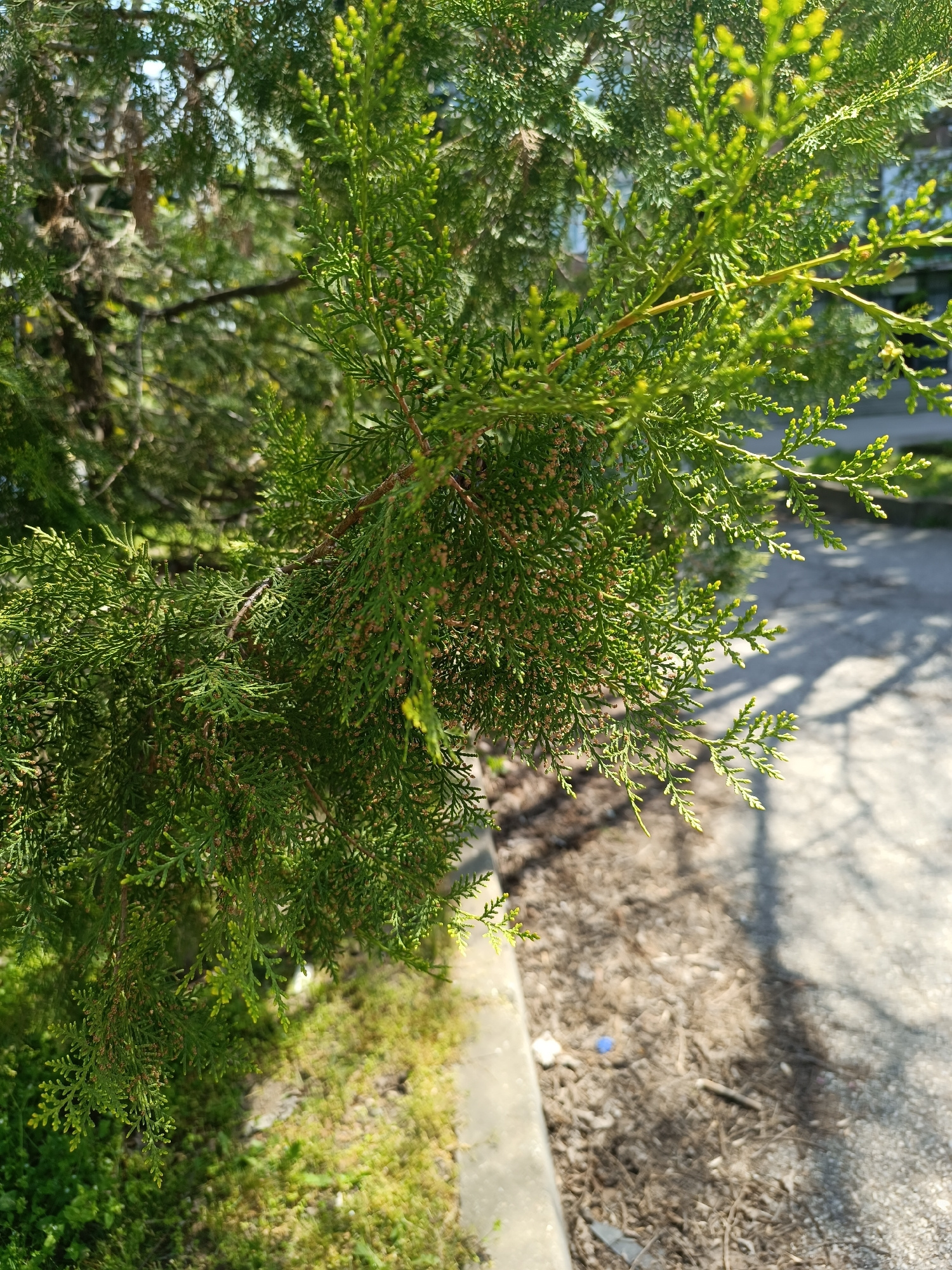 A close-up shot features the vibrant green foliage of a coniferous plant, likely a cypress or juniper, with dense, scale-like leaves. The plant exhibits both mature dark green sections and lighter, br…read more