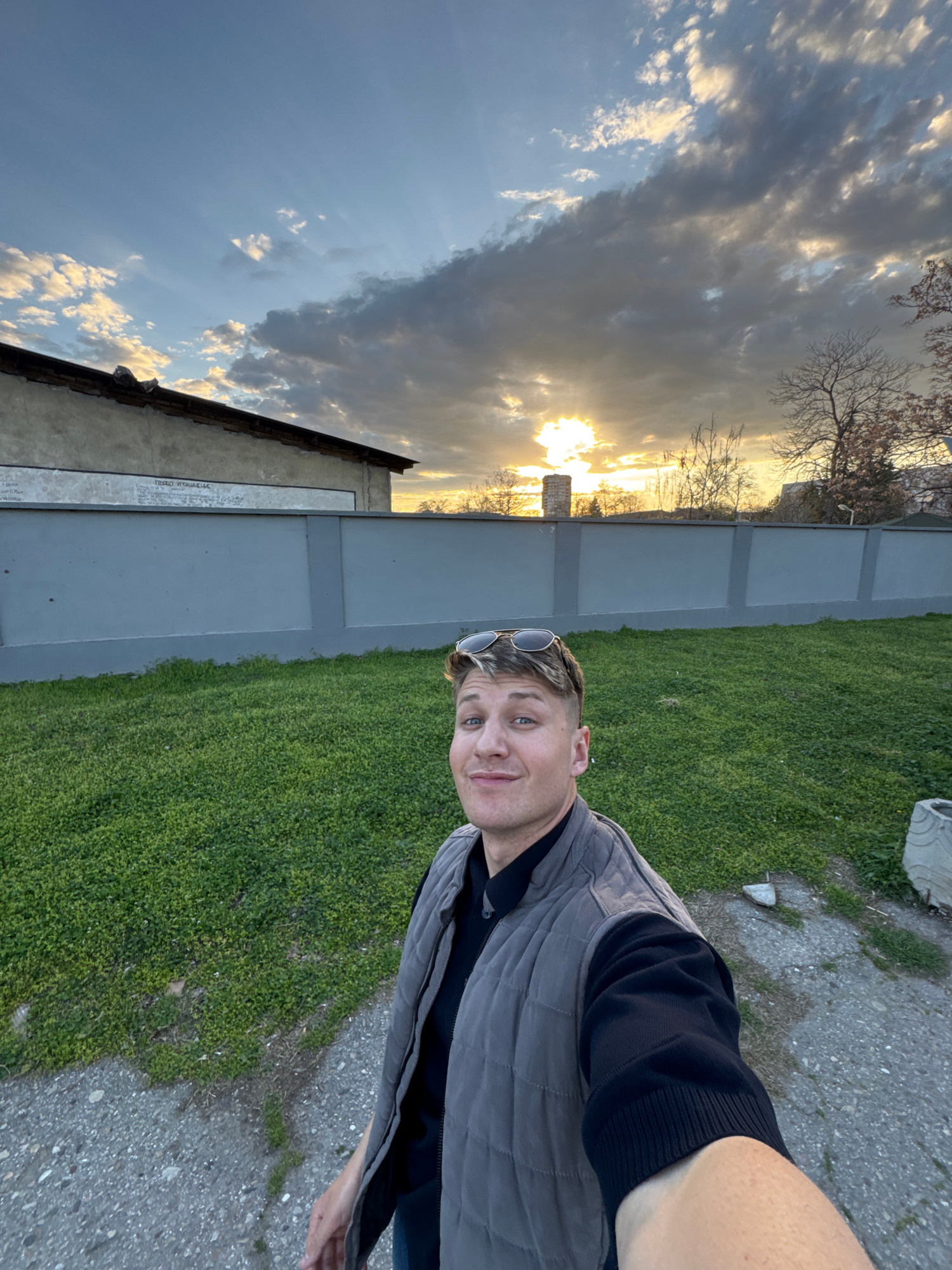 The image is a selfie of a man standing next to a gray fence, with grass on the right and a structure with writing on the left. The sky is visible in the background, with clouds and a sunset. The pict…read more