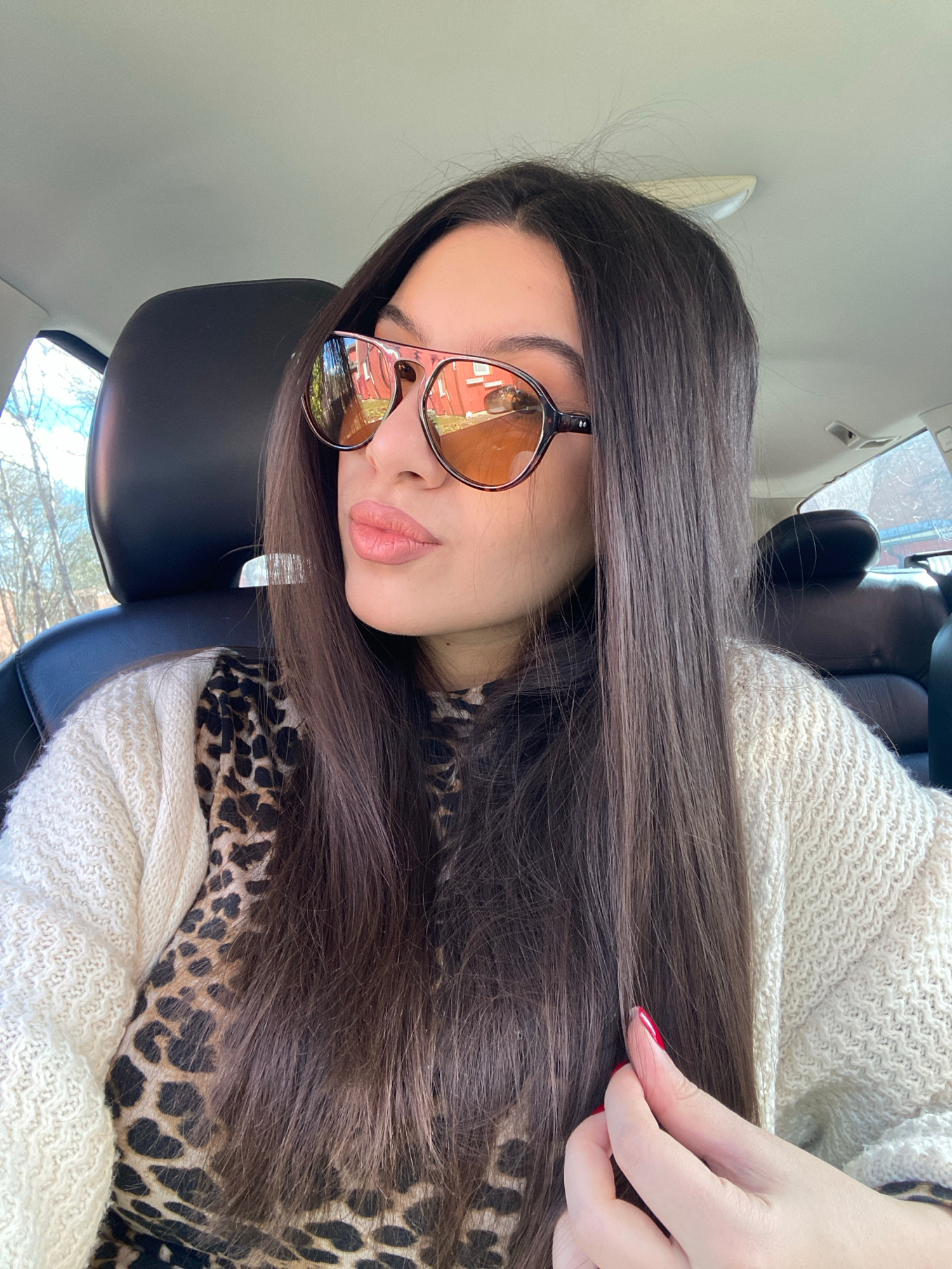 A woman with long, dark brown hair and brown sunglasses is pictured inside a car. She wears a leopard print shirt layered with a white knit sweater. Her hand with red painted nails is near her hair. T…read more