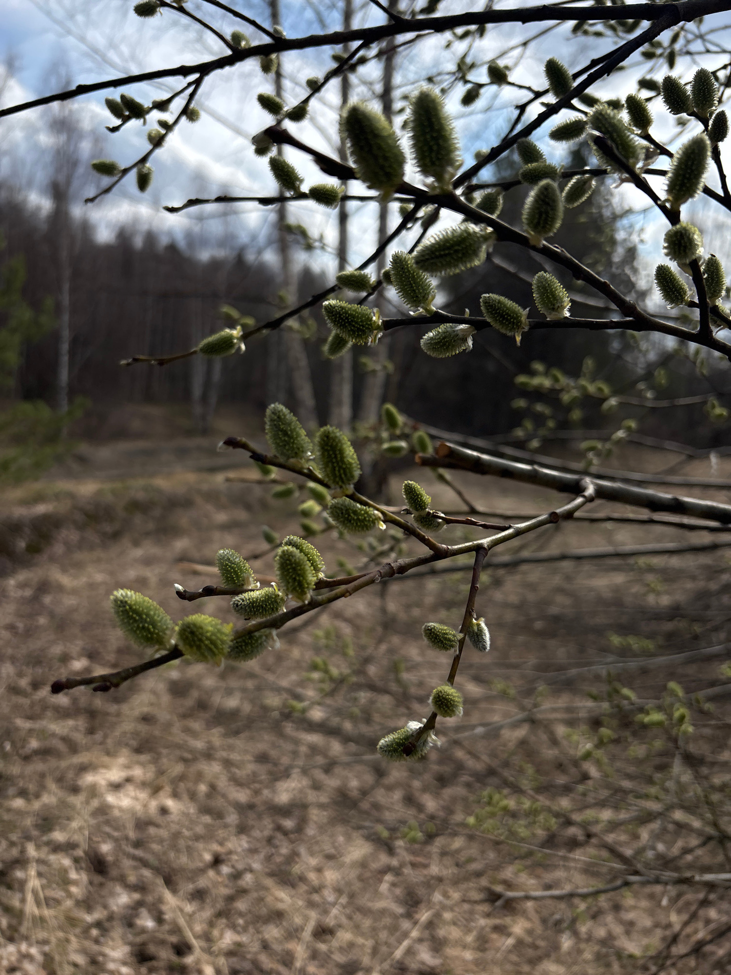 The image shows pussy willow branches in spring, likely in a natural area within or near Chernushka, Russia. The branches are adorned with green, unopened catkins. Some branches are seen against a bac…read more