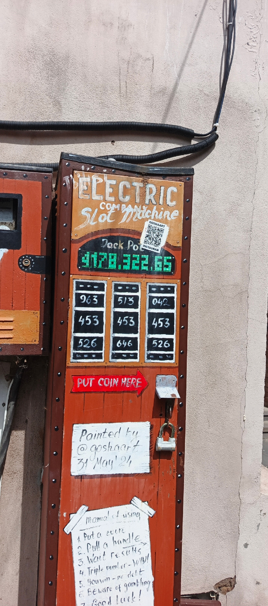 An artificial, painted, brown-colored slot machine is affixed to a stucco wall in Tbilisi, Georgia. The slot machine is labelled "Electric Company Slot Machine" with a 'jackpot' of $178,322.65. The ma…read more