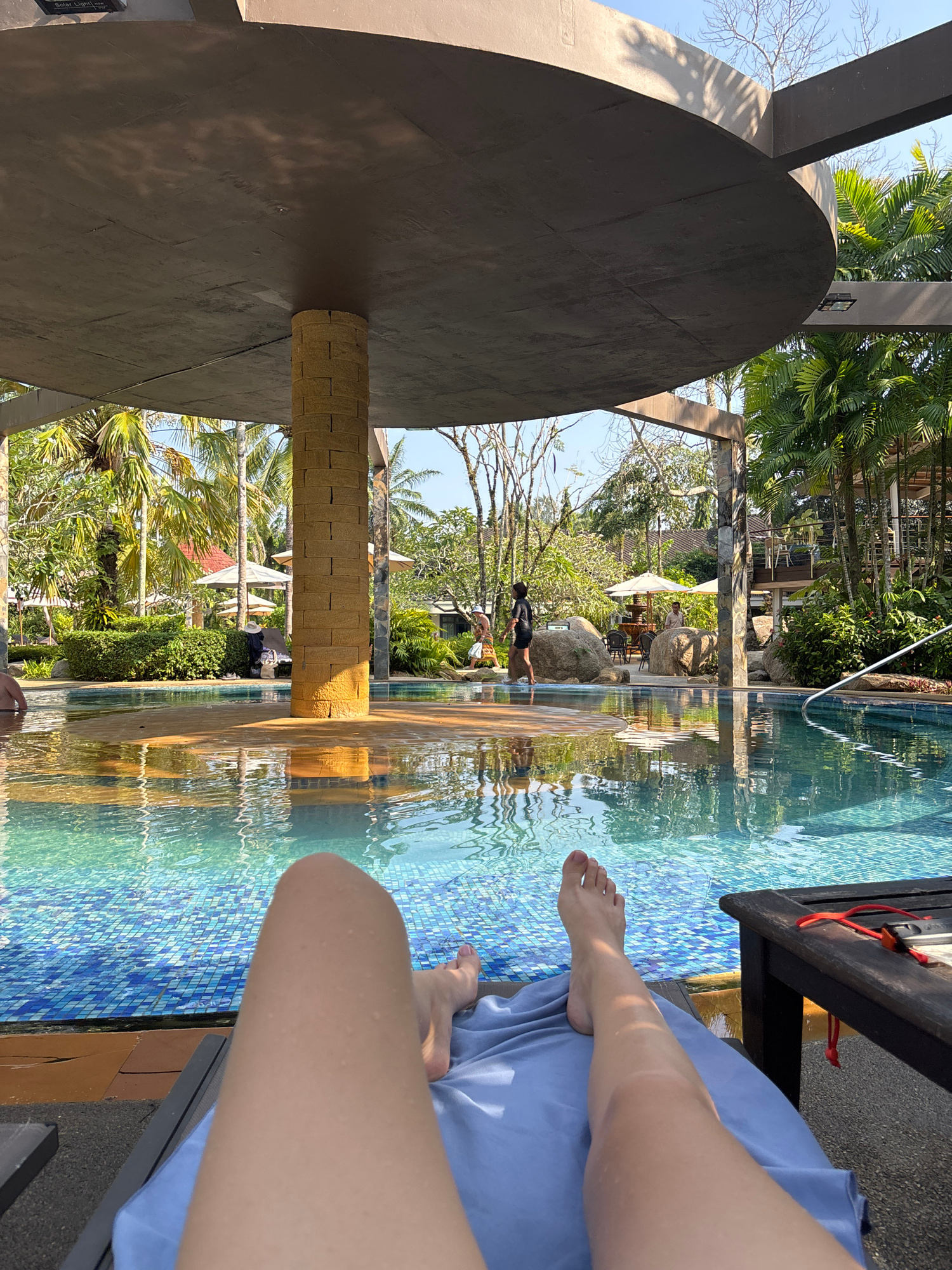 The image shows a scene at a swimming pool in Khok Kloi, Thailand. A person is sitting on a lounge chair next to the pool, visible from the knees down. The person is draped with a blue cloth. The pool…read more