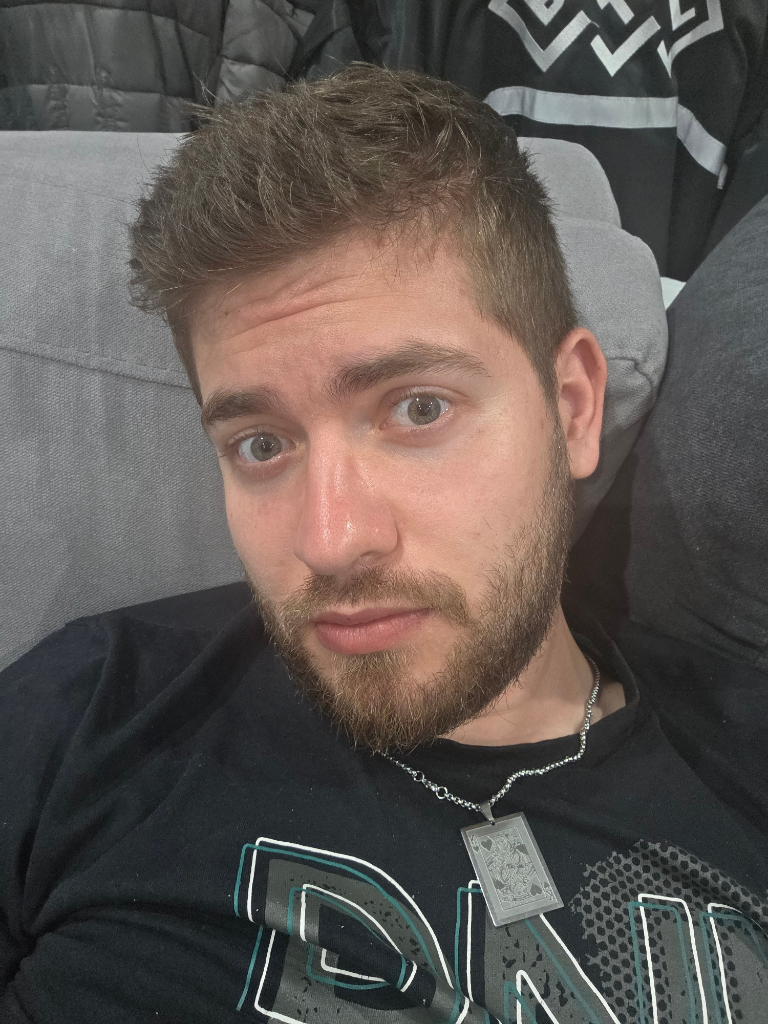 A close-up, angled shot captures a man with fair skin and a beard, possibly in his late 20s to early 30s. He is lying down, with his head resting on a light gray pillow. His hair is short, textured, a…read more