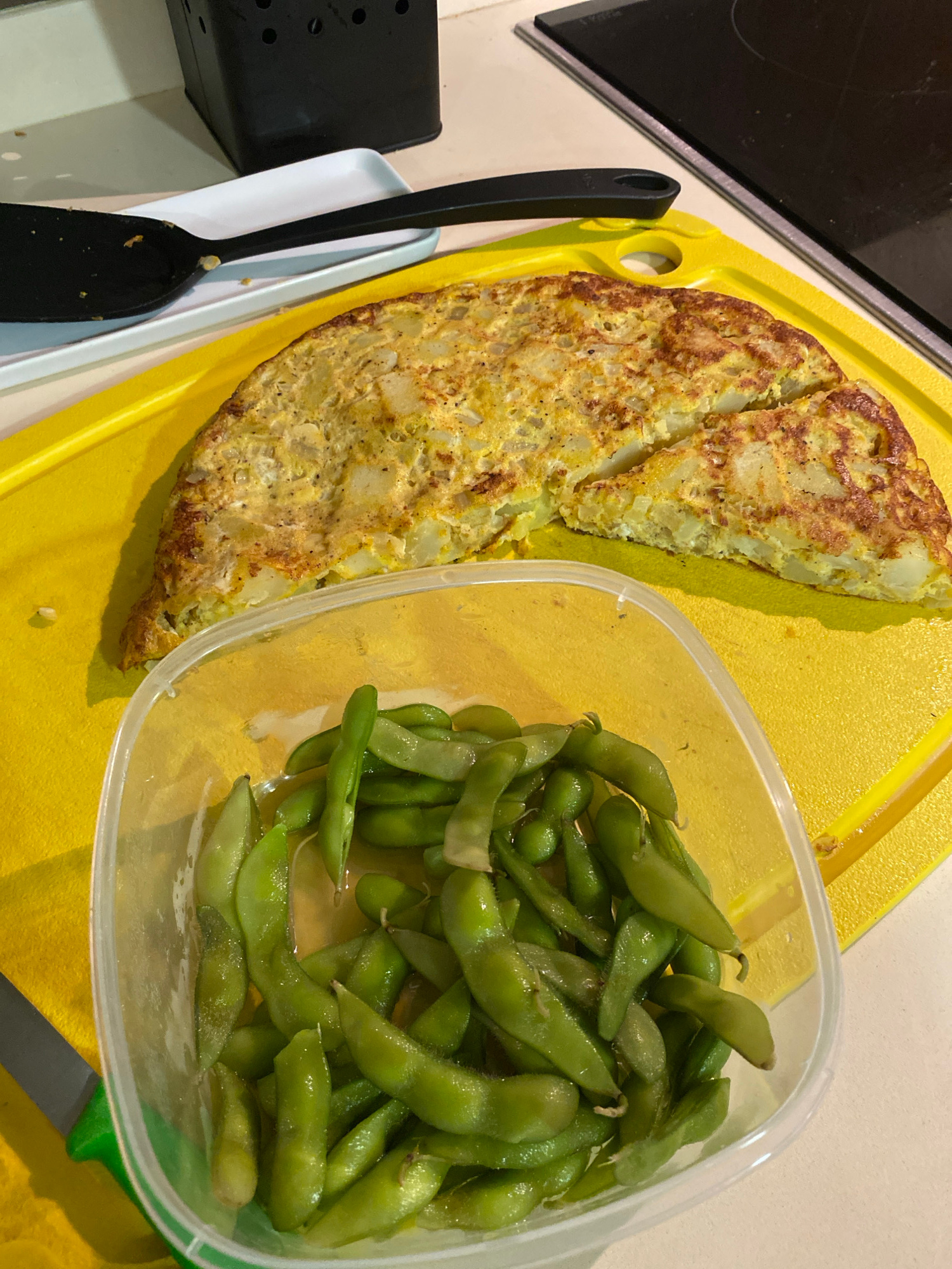 A still life photograph shows a yellow cutting board upon which a portion of tortilla Española (Spanish omelet) sits alongside a transparent plastic container filled with edamame. The tortilla is gold…read more