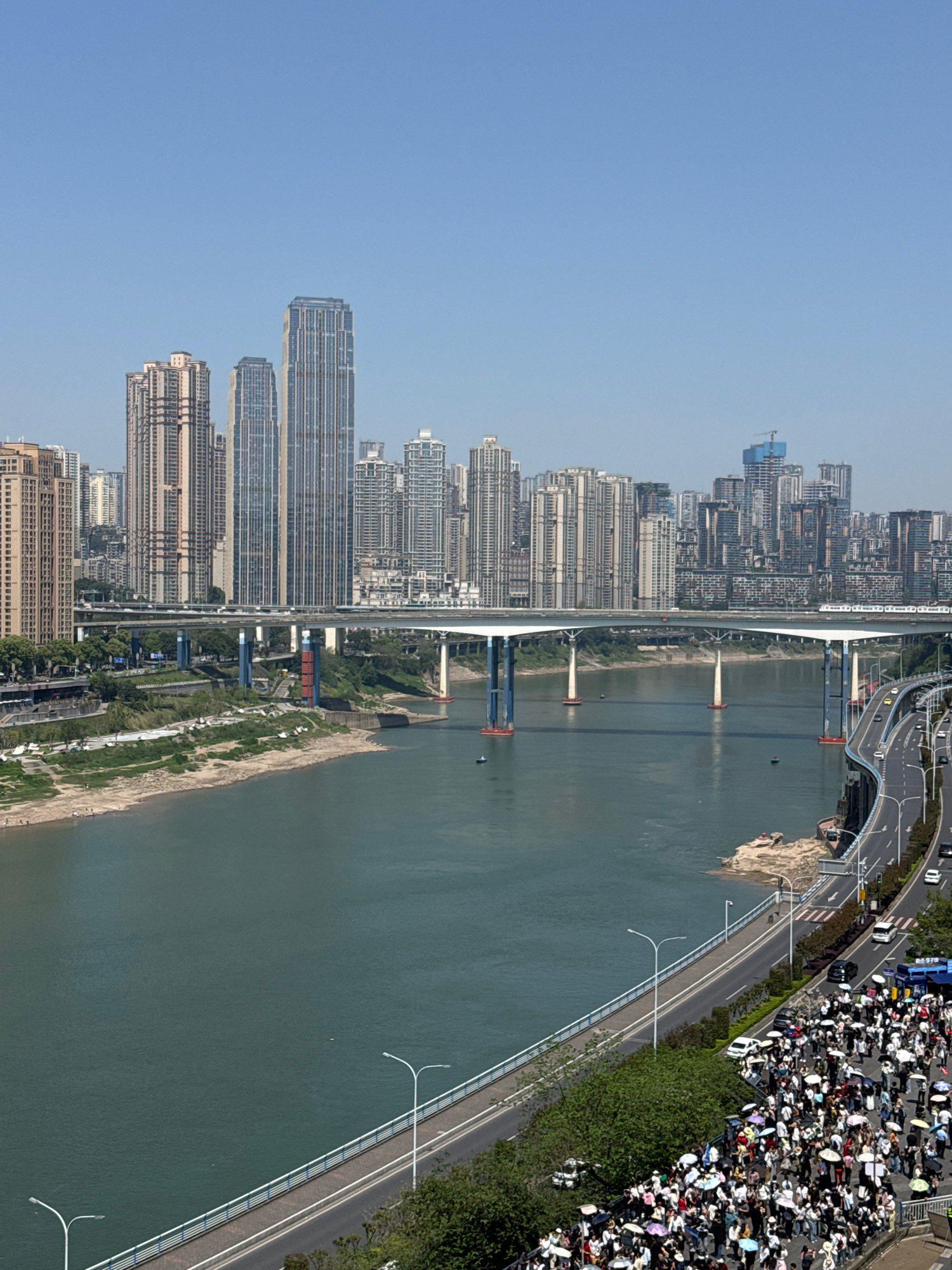 The image depicts an aerial view of the city of Yuzhong District, China, with a prominent body of water bisecting the scene. Parallel to the water, there is a densely populated area, suggesting a bust…read more
