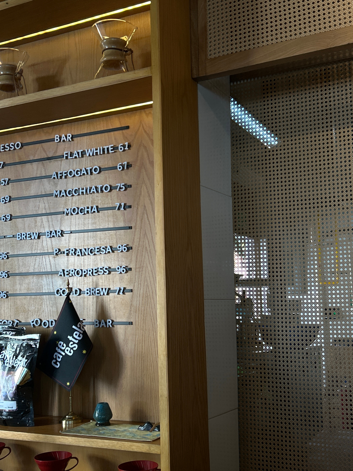 This media file presents an interior view of a cafe in Mazatlán, Mexico, focusing on a display area or counter. No people are visible. The scene is dominated by a vertically arranged menu board crafte…read more