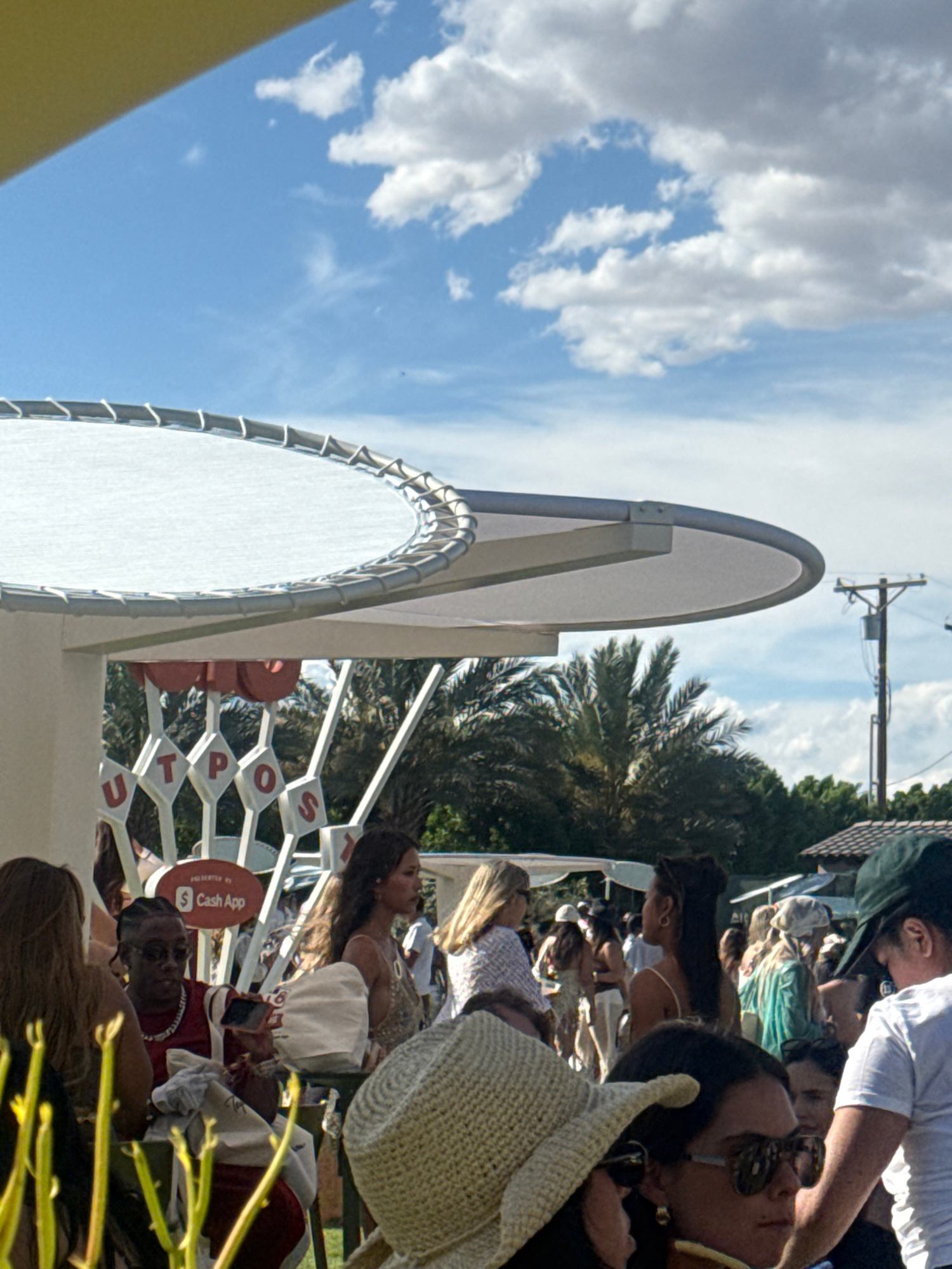 A medium shot shows a gathering of people under a structure in the city of Indio, California, United States. The structure includes a large, circular white surface and is labeled with the word "SPOT."…read more
