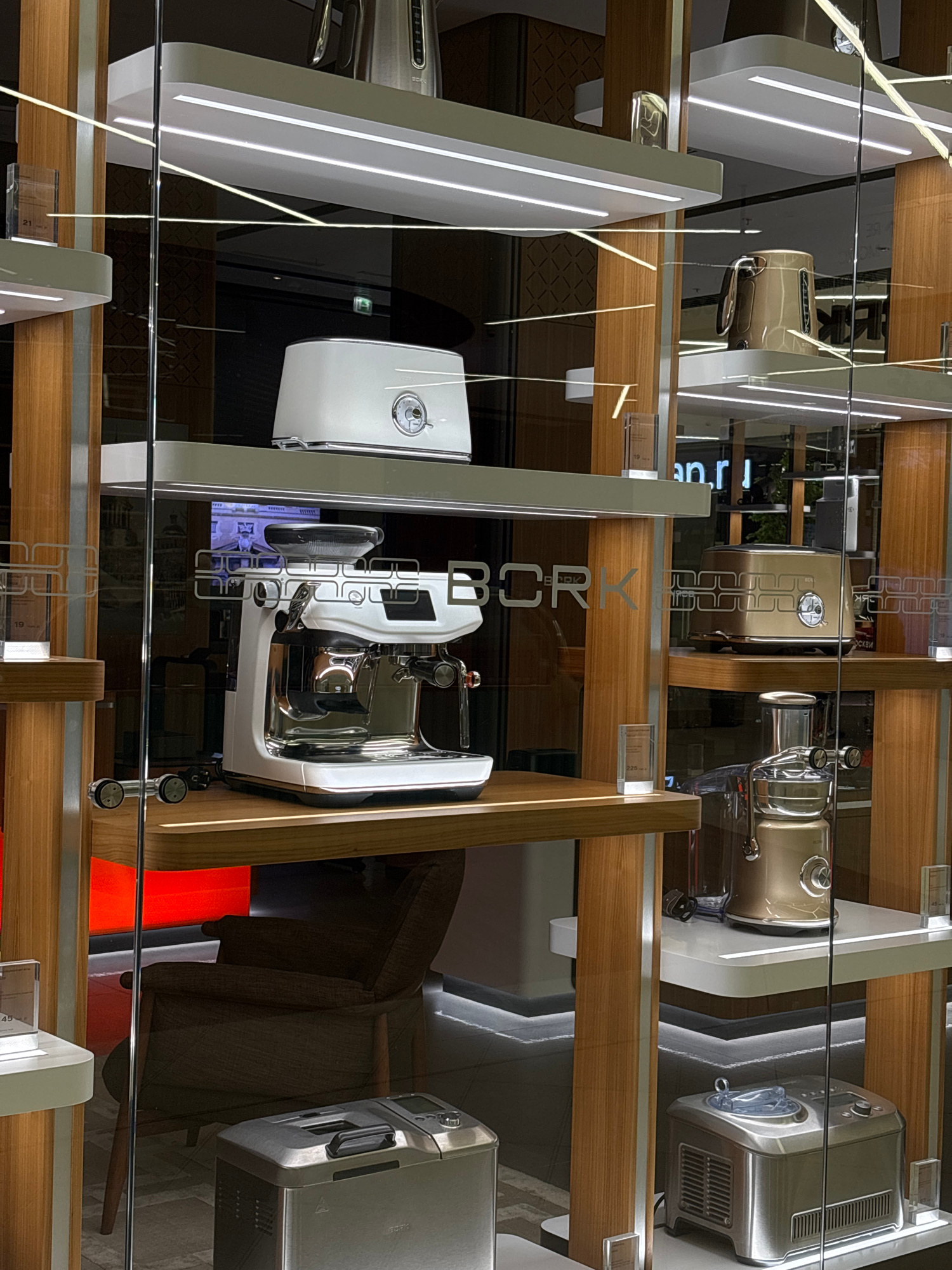 The image shows a display case of BORK brand small kitchen appliances, including coffee machines and food processors. The display is likely in a BORK retail store. The city mentioned, Perm, Russia, ca…read more
