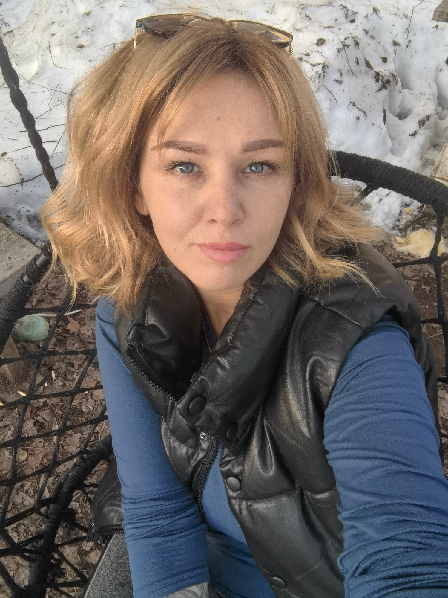 A blonde woman with fair skin and freckles, wearing sunglasses on her head, a black puffer vest over a blue long-sleeved shirt, is seated in a black woven chair. The chair sits on a patch of ground co…read more