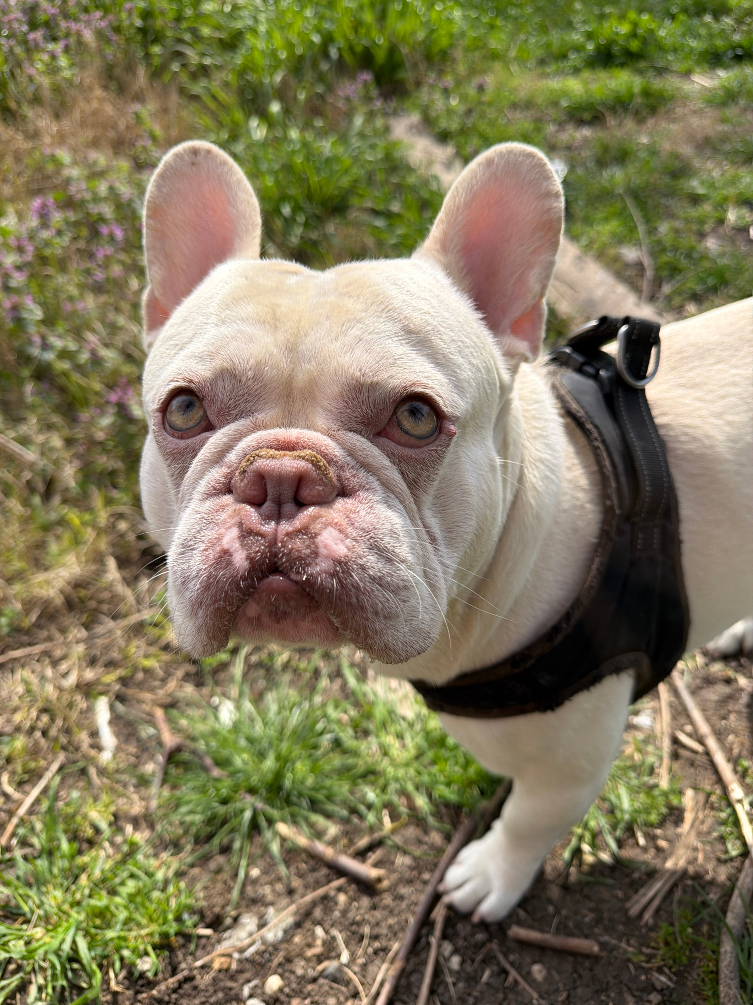 A close-up, high-angle photograph shows a white French Bulldog outdoors. The dog is wearing a black harness. The background consists of grass, dirt, and small twigs. The location is not specified.