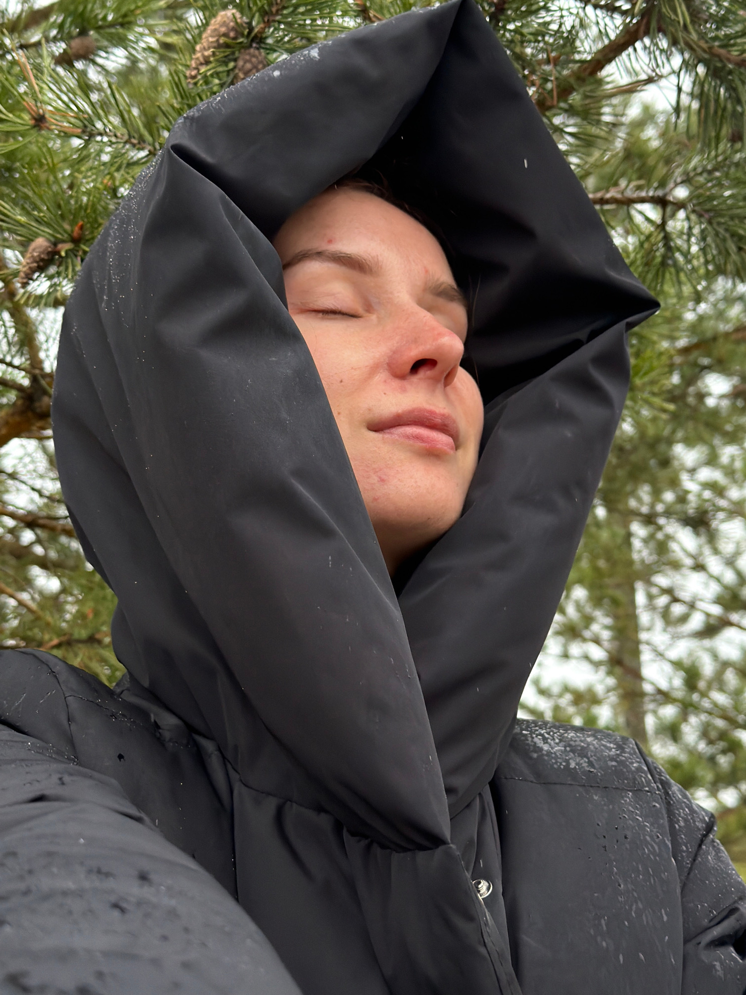 A person with eyes closed is lying down and facing upwards, with a large black hood surrounding their face. The person's nose and lips are visible, and there are some minor blemishes on their face. Th…read more