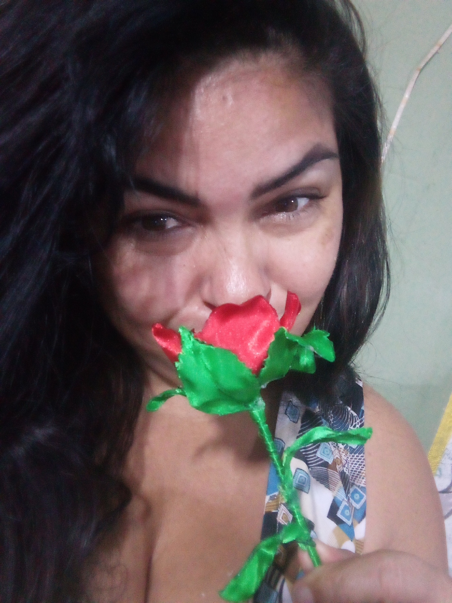 A person with dark hair and light skin is holding a red and green artificial rose up to their nose. The person is wearing a top with a geometric pattern in blue, white, and brown. The background is a…read more