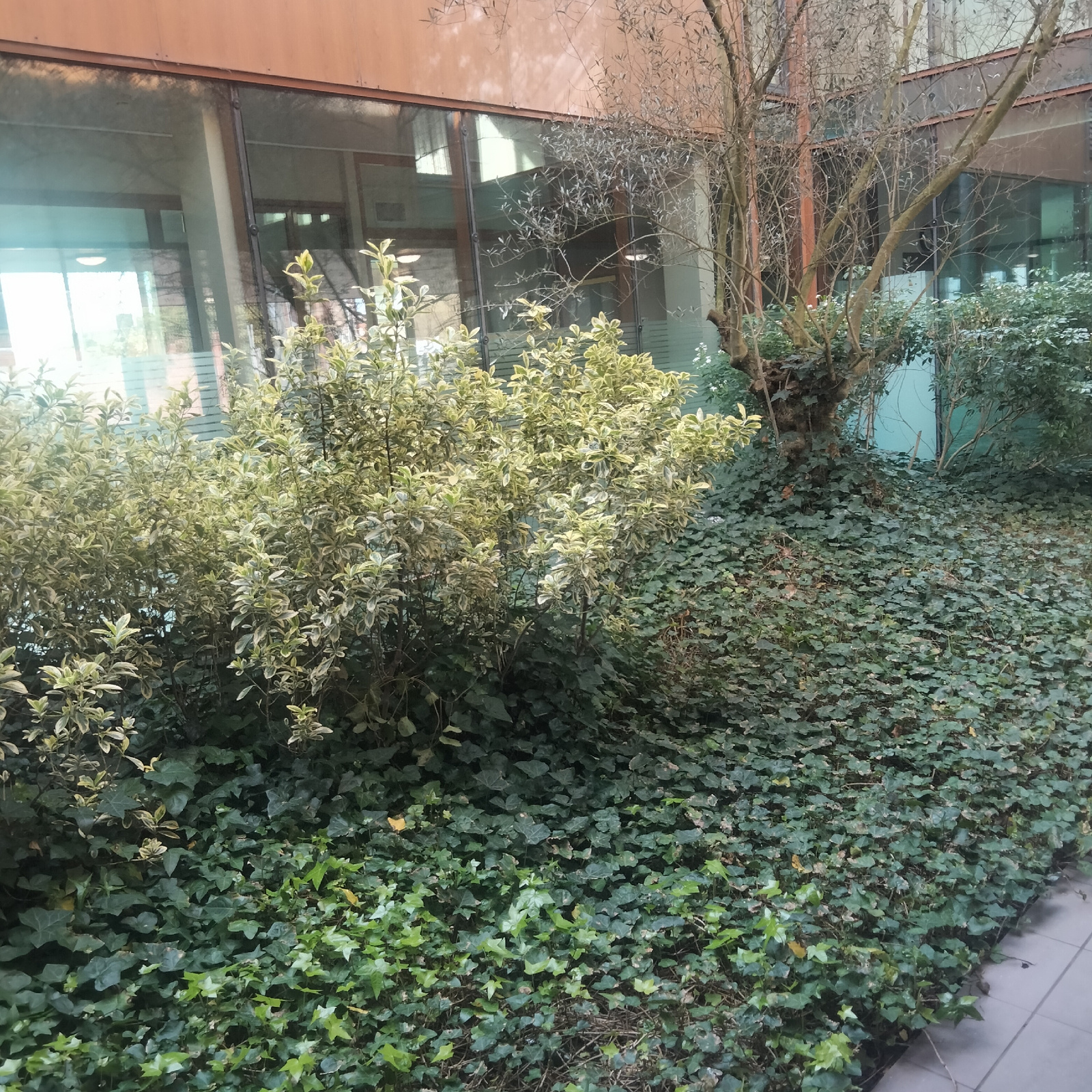 The image depicts a courtyard garden located in Roubaix, France, featuring a dense ground cover of ivy. In the foreground is a vibrant bush with variegated green and yellow foliage. Further back, a ba…read more
