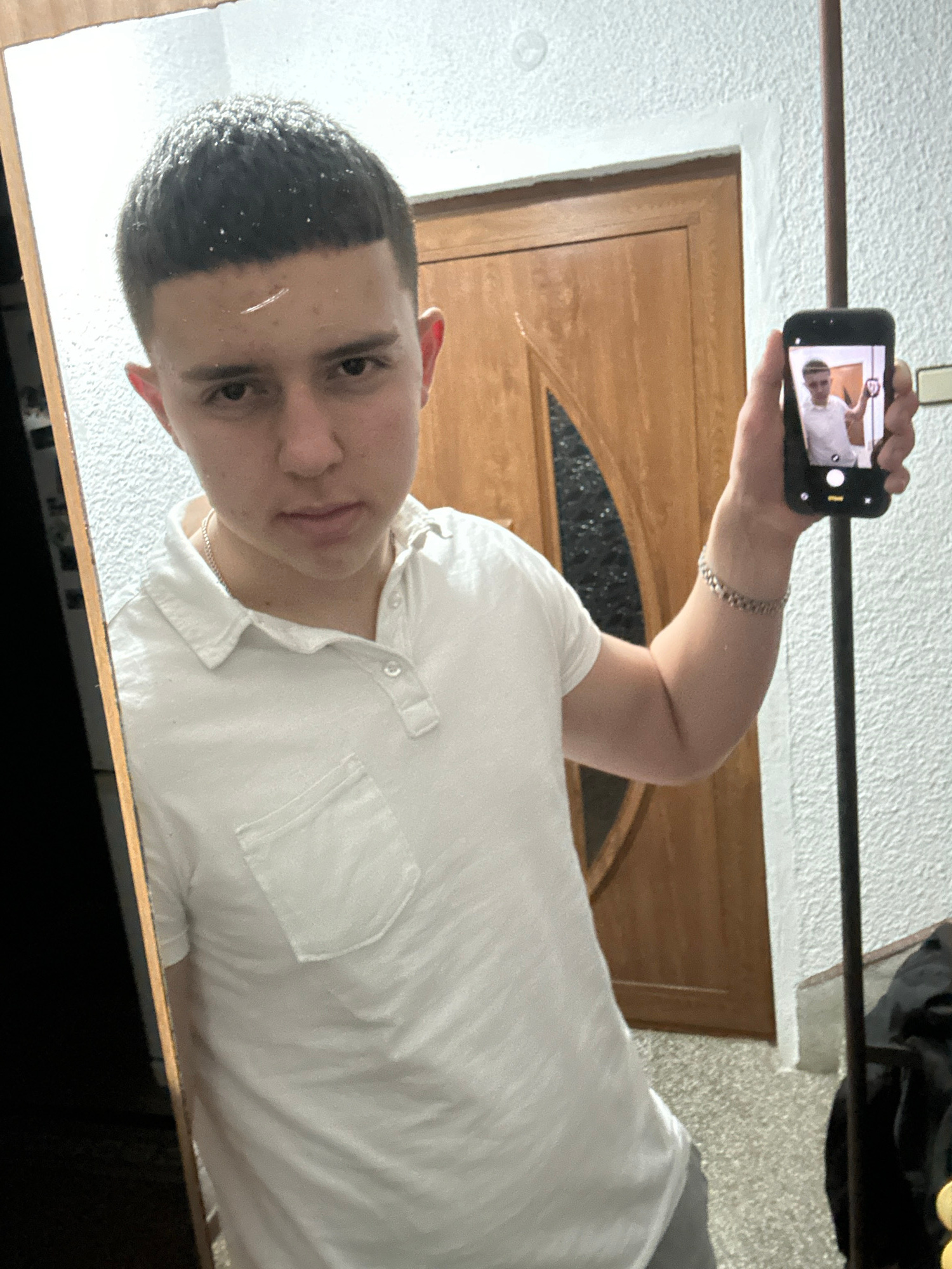 A person with short, dark hair is taking a selfie in a mirror. The person is wearing a white shirt and a silver necklace. The person is holding a black smartphone in their left hand, displaying an ima…read more