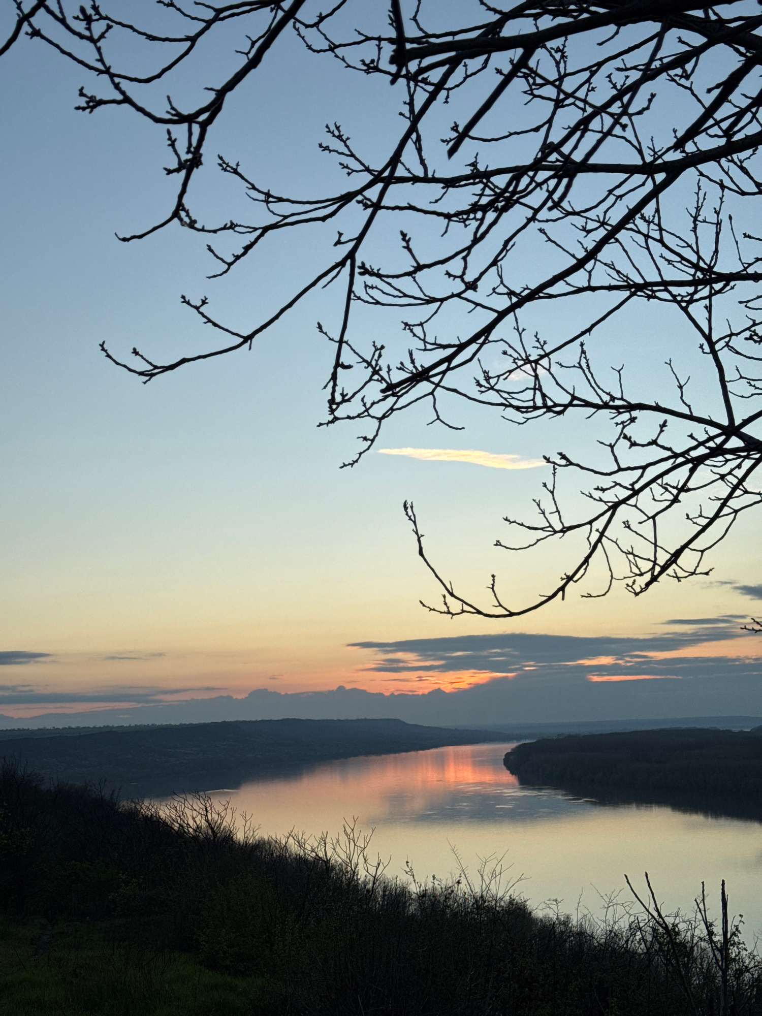 The image depicts a landscape with a body of water, likely the Danube River, at sunset or sunrise, and branches of a tree in the foreground. The sky is transitioning from a pale blue to hues of orangeβ¦read more