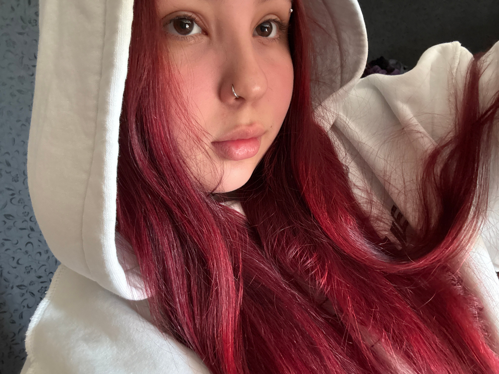 A person with long, red hair and fair skin is wearing a white hooded sweatshirt. They have brown eyes, a nose ring, and a piercing on their eyebrow. The background includes a wall with a subtle floral…read more