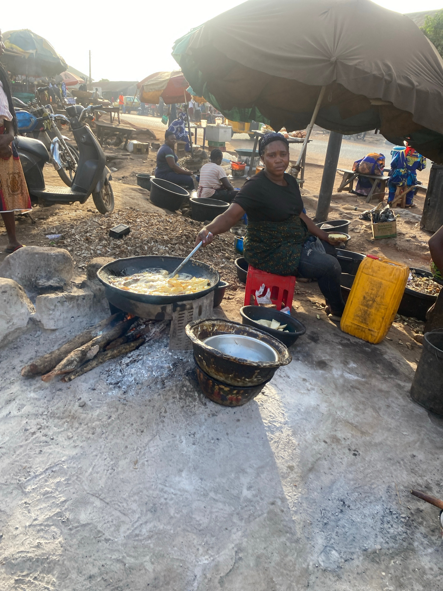 A woman is seated on a red plastic crate on a concrete surface, facing the camera. She is stirring a large, blackened frying pan over an open fire built on top of large rocks. A cooking oil container…read more