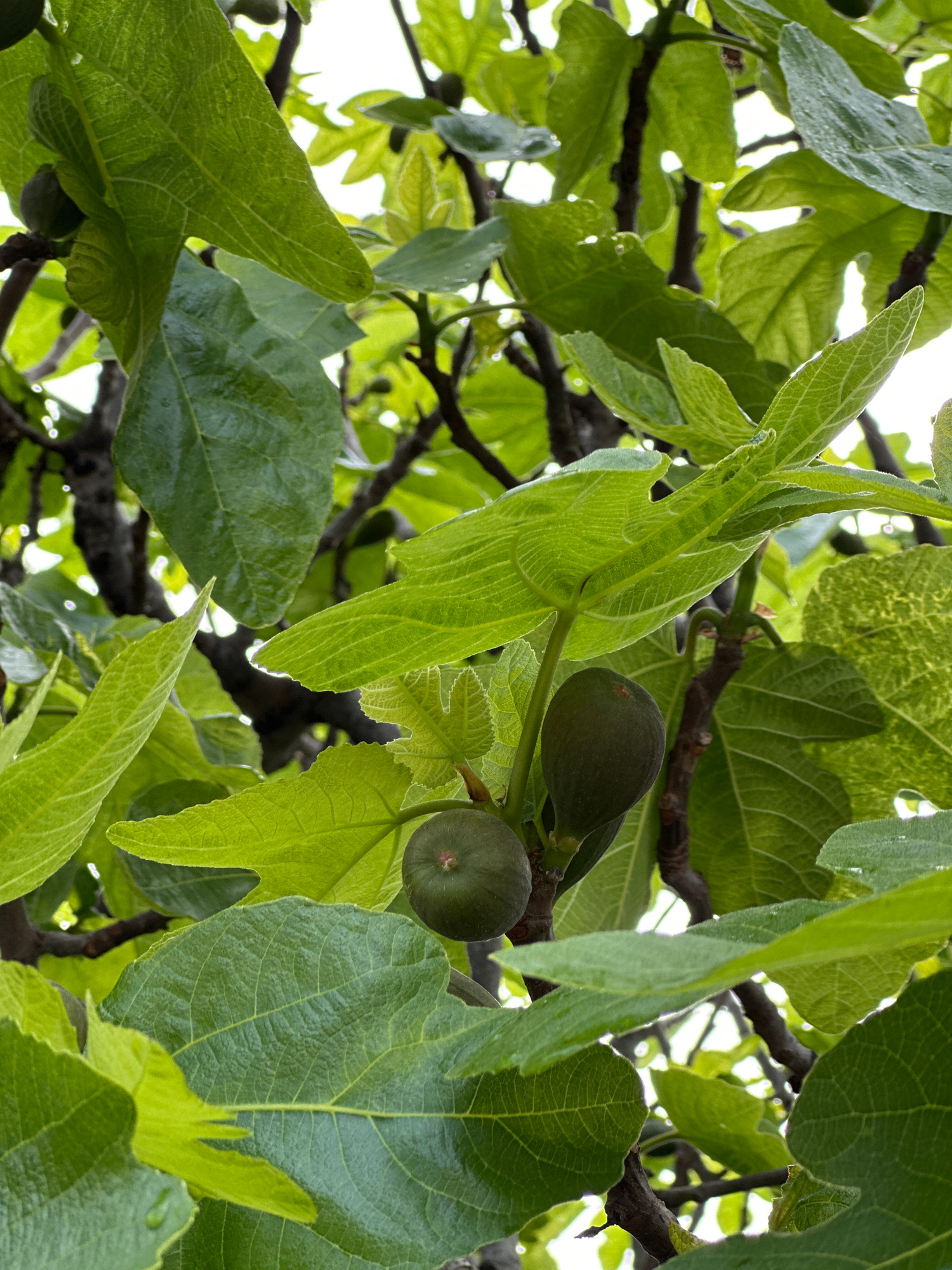 The image shows a close-up view of a fig tree, likely in Šušanj, Montenegro. Two unripe, green figs are visible amongst the tree's large, lobed leaves and branches. The leaves vary in size and color,…read more