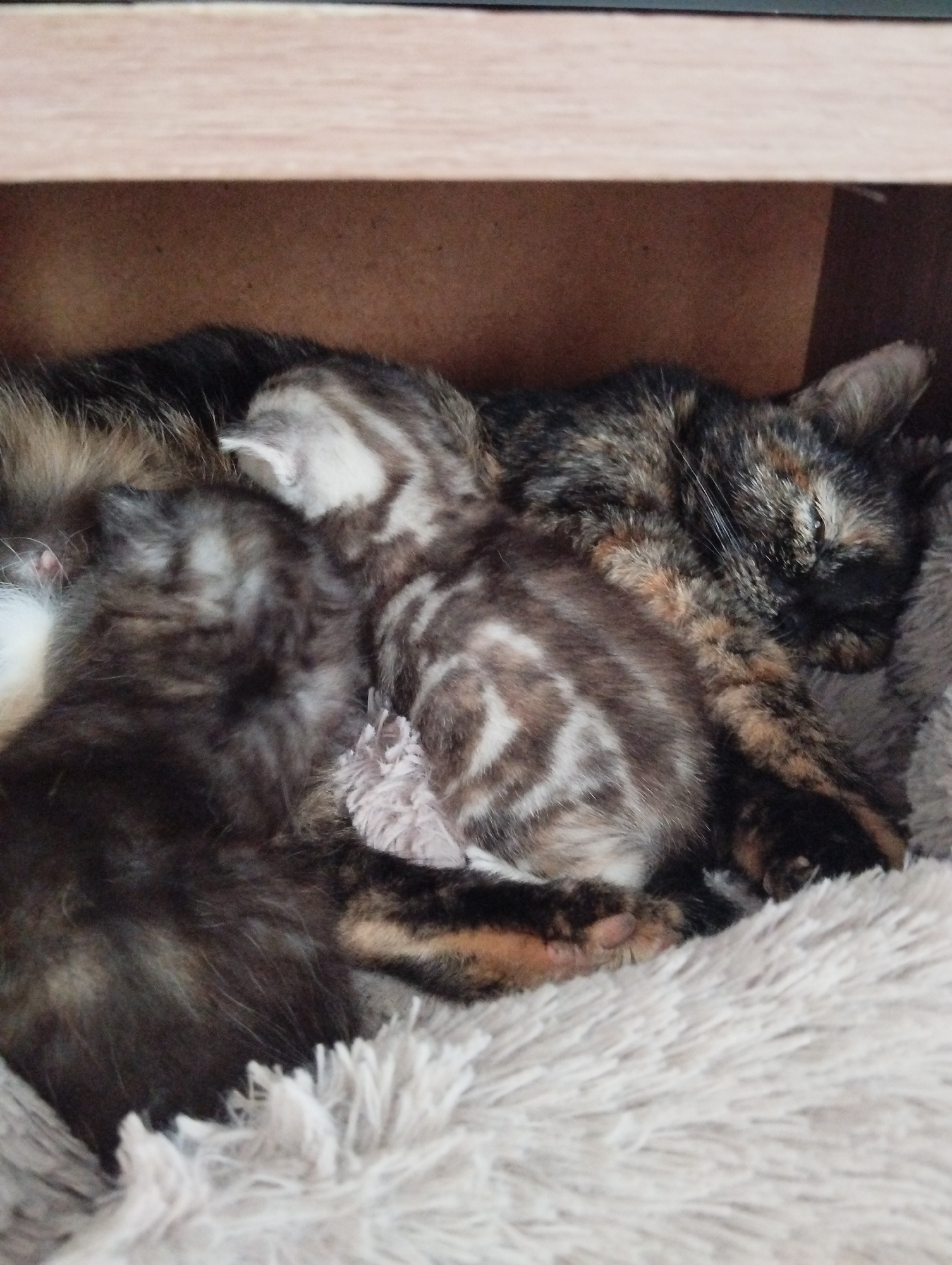 In an indoor setting, under a wooden shelf, a tortoiseshell cat is sleeping on a soft, furry bed. Two kittens are nestled close to the mother cat. The kittens have tabby markings. The location is Kras…read more