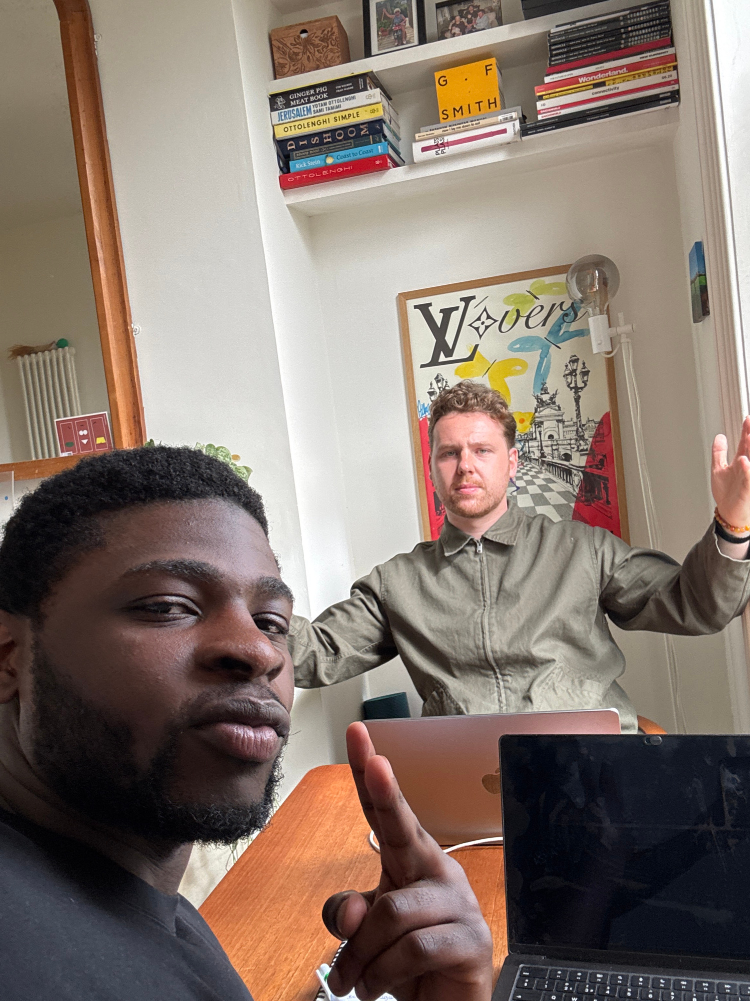 Two men are depicted indoors, likely in a home or office setting, featuring a bookshelf and artwork. The image, taken from a slightly low angle, shows a Black man in the foreground, his right hand poi…read more