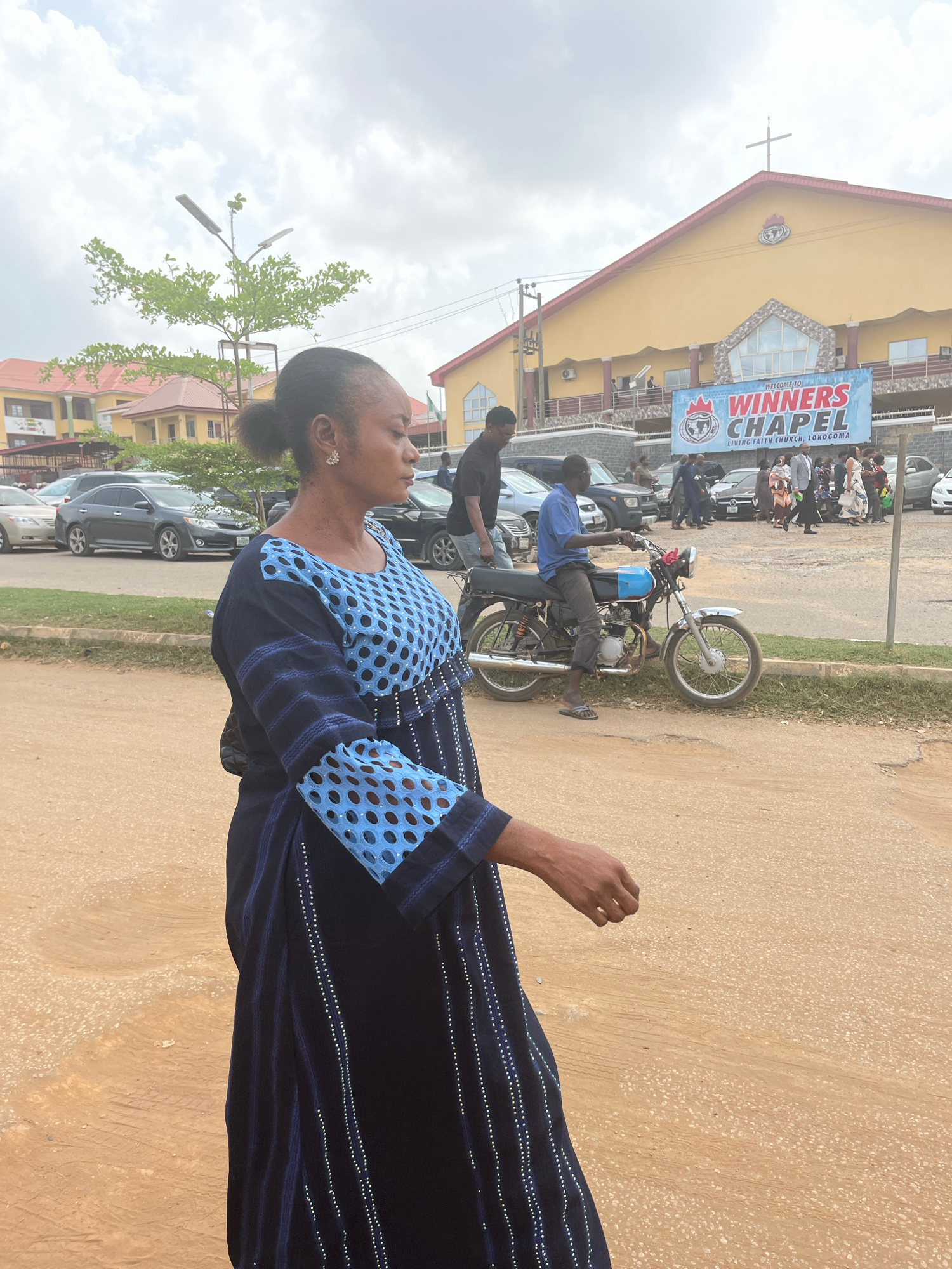 The image shows a woman standing on a paved road in front of Winners Chapel Living Faith Church in Lokogoma, Abuja, Nigeria. She is wearing a navy blue dress with light blue polka dot sleeves and a yo…read more