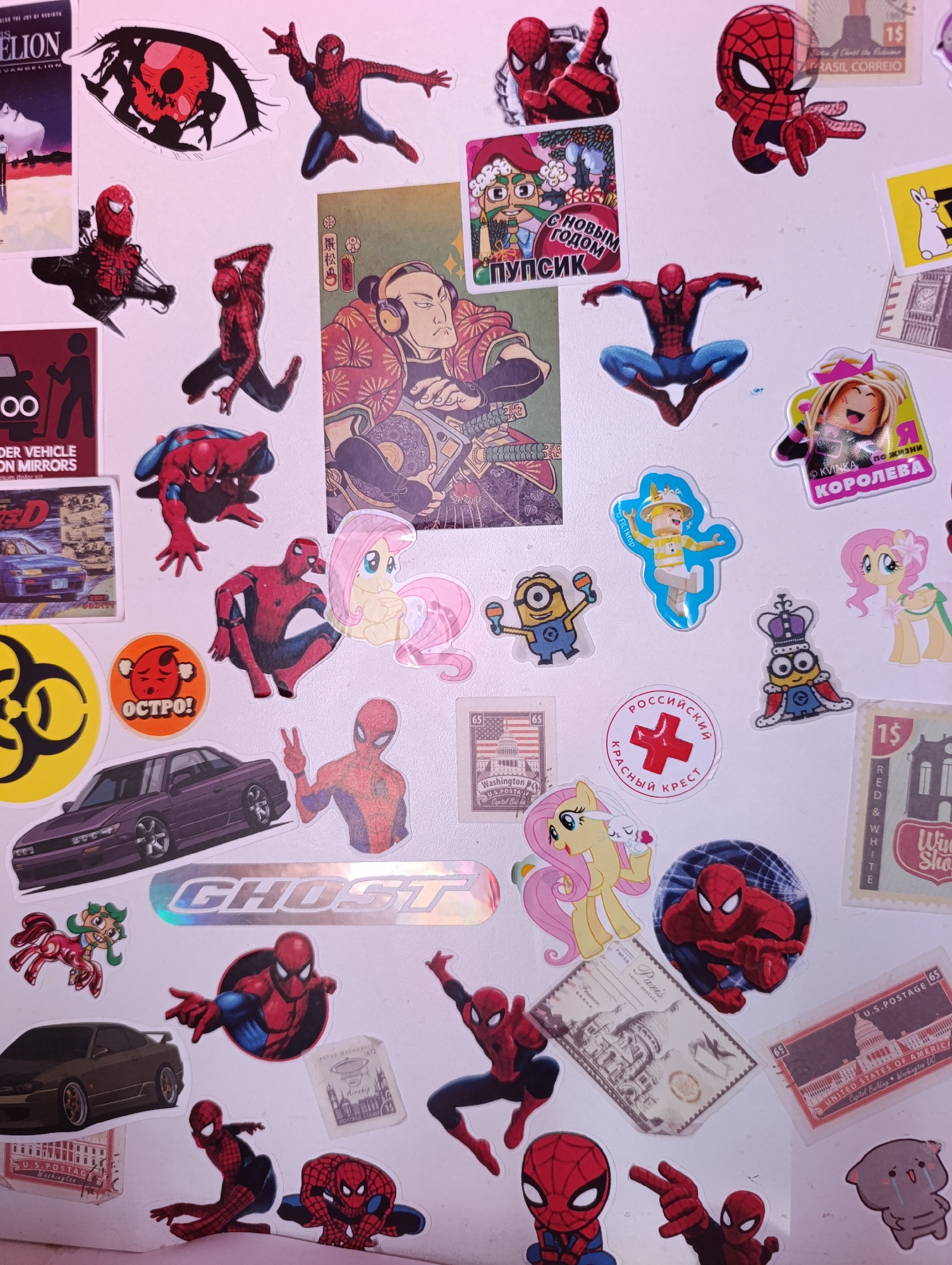 This image shows a surface covered in a variety of stickers. Subjects include multiple iterations of the Spider-Man character, My Little Pony characters, anime imagery, and various cartoon characters.…read more