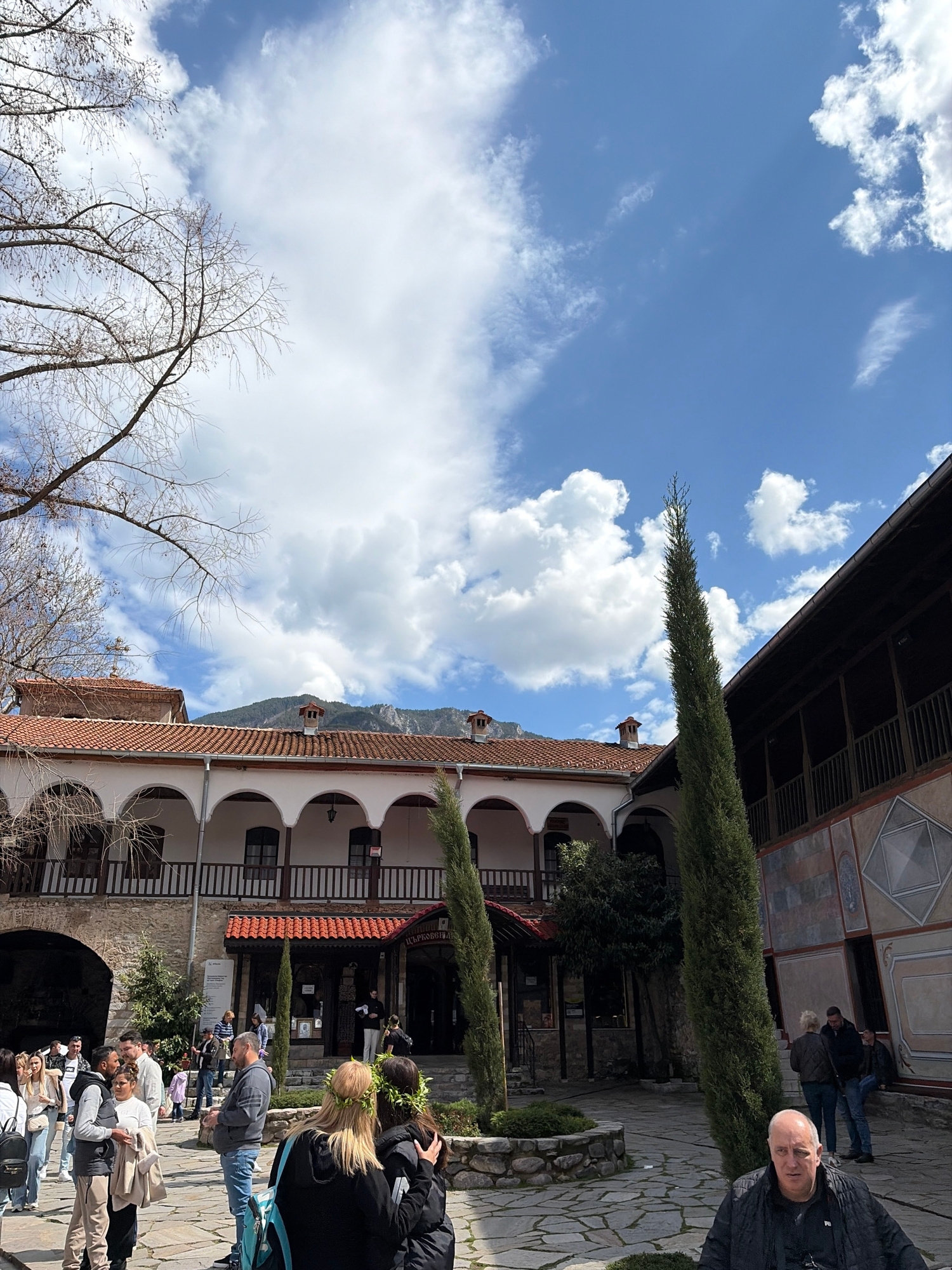 The image shows a courtyard in the Bachkovo Monastery, Bulgaria. The courtyard is paved with stone and surrounded by buildings with arched walkways. People are present in the courtyard, including tour…read more